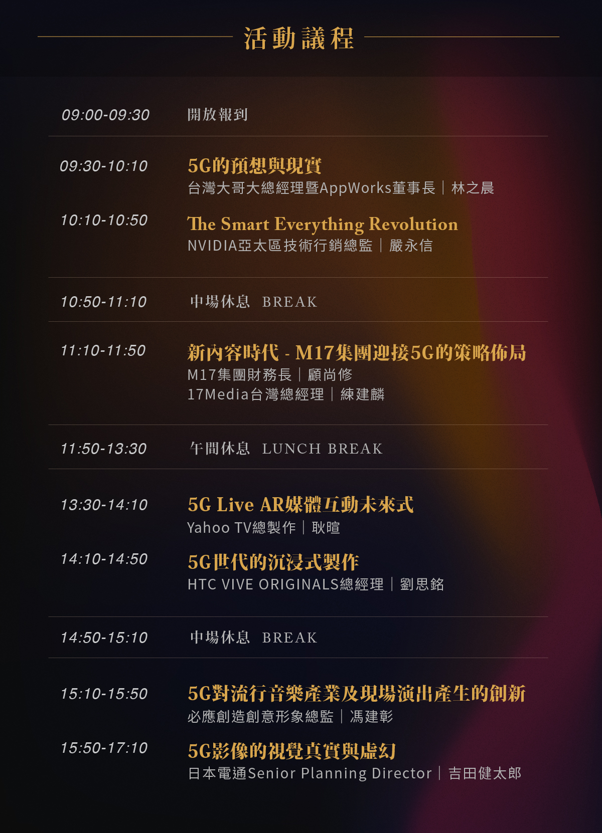 同樣的,「5G」將帶來全新的傳播方式,勢必影響內容的創新、製作及傳播分配的方式!而產生全新的產業生態系統,我們又該如何掌握與應用?滾石文化將聚焦娛樂產業及內容產業,透過《5G日》邀請 8 位來自電信、行銷、音樂、影視、遊戲及展演等業界精英,探討最新趨勢與5G相關應用!