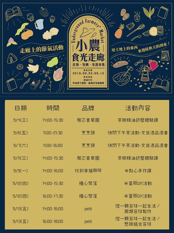✍ 六大主題的節氣活動,當季水果釀造酒品嚐、新米烘焙點心、澳洲茶樹精油體驗、綠色苔球DIY等,深入地底感受與大地的親密感,一起用土地上的東西來迎接秋天的到來!