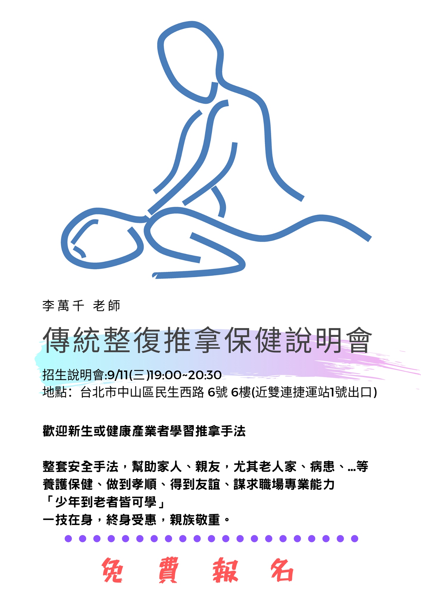 今日健康養生時代的來臨,此學習傳統整復推拿手法,藉以養身保健以達身心靈發展,進而因應社會需求,特開設健康養生課程。