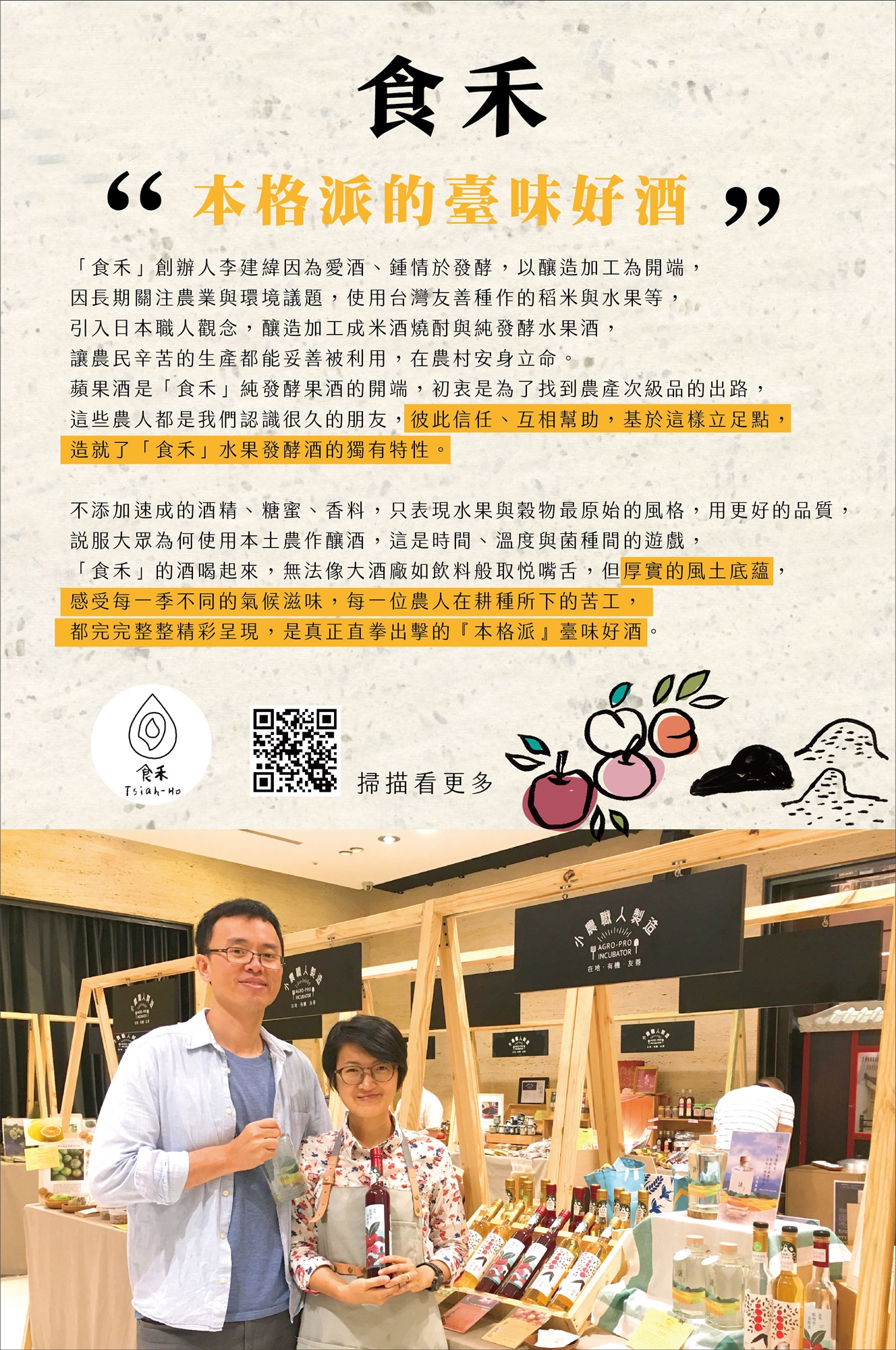 講者簡介:食禾創辦人李建緯,曾在主婦聯盟工作,2015年於日本學習釀造清酒的技術,回台灣後創立了食禾,希望能用台灣的農產品實驗釀造酒,做出可以表現台灣當地風土的酒。
