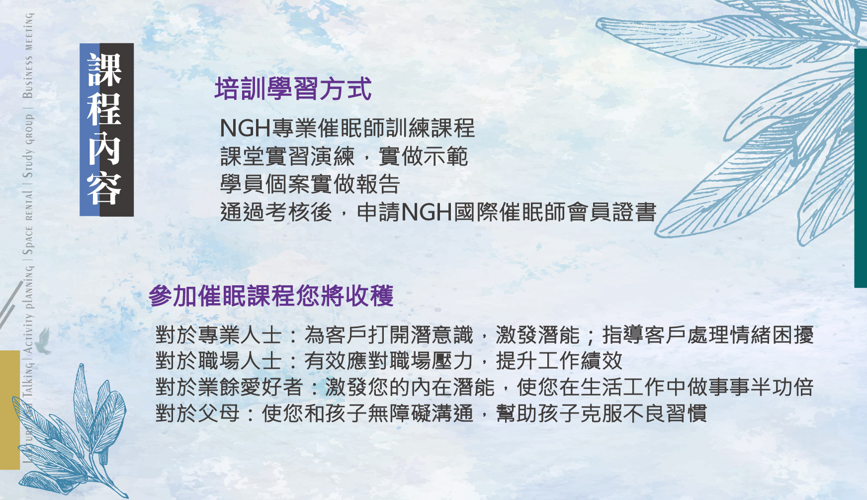 【美國NGH催眠師認證課程】- 四日全天課程。