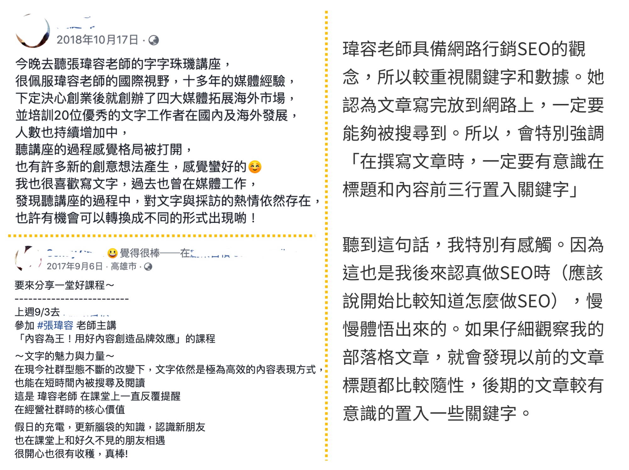 媒體寫作經驗十餘年,採訪超過 700 位名人及企業家。2017 年從「數位媒體經營」轉戰「內容創業」,一年服務超過 80 家品牌客戶,2018 年經手超過 3000 則新聞,內容行銷相關主題授課超過 600 小時。