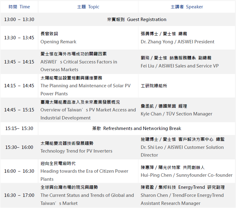 During Energy Taiwan, AISWEI and EnergyTrend will be holding a major industry conference, titled “Energy Trends Forum and Technical Seminar”. Experts from AISWEI, TUV, ITRI and Sunnyfounder along with EnergyTrend analyst will be at the conference to present their views on the latest developments in inverter technologies and on the key trends in the global solar market. Attendees of this program can expect insightful analyses that will be valuable in maintaining the healthy growth of the whole solar industry.