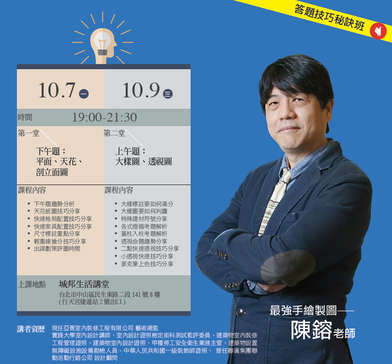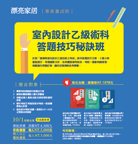 5. 《室內設計手繪製圖必學1 平面、天花、剖立面圖》、《室內設計手繪製圖必學2大樣圖》及《室內設計手繪製圖必學3透視圖》3本書為指定教材,並包含在課程費用中,若已事先購書者,請攜至現場,將補贈漂亮家居等值叢書。