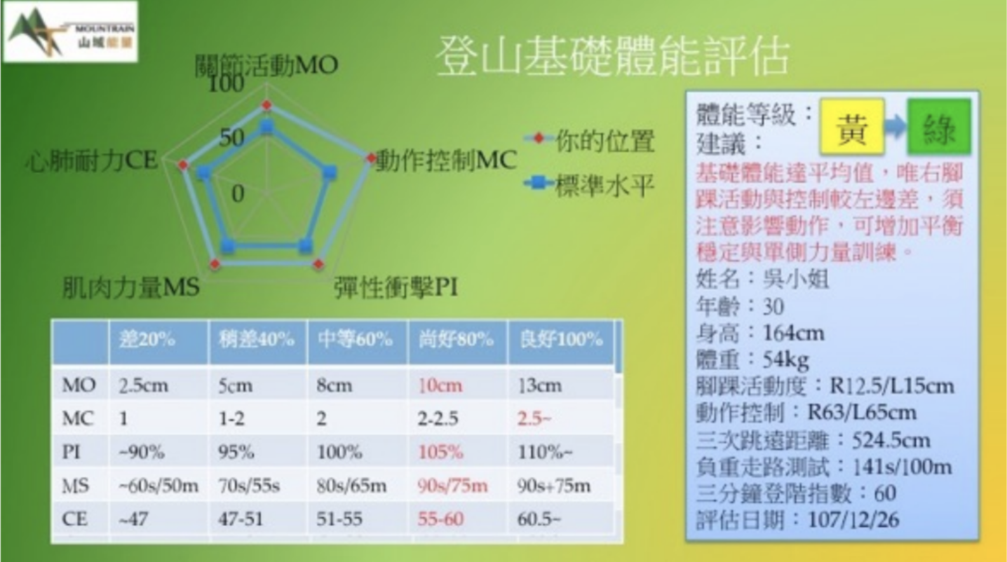 對登山運動而言,也有其體能的『獨特性』,而當登山體能可以被『量化』評估,就能清楚知道自己的體能水平,然後再針對其弱點強化,預防傷害,提升運動表現,使登山更安全!