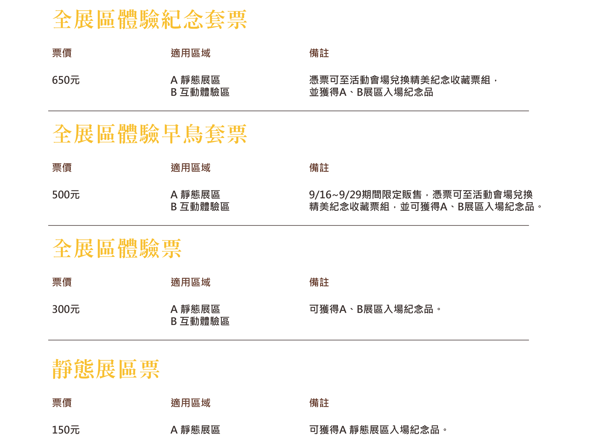 2. 其他票種 9/30 () 12:00 ~ 11/29 () (靜態展區票/愛心票)或12/1 () 19:00(全展區體驗票)