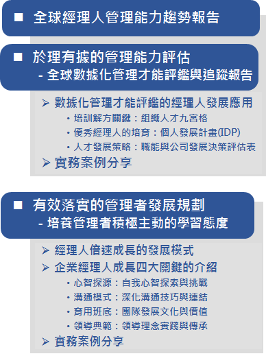 因此在這自覺、自發、自主的學習時代,邀請您一起來研討如何有效運作與落實企業經理人的培訓發展,促成經理人對市場、對趨勢主動的探索→拓展→連結,在面對企業危機與創新展現領導的彈性,以因應未來動盪快速的世界。