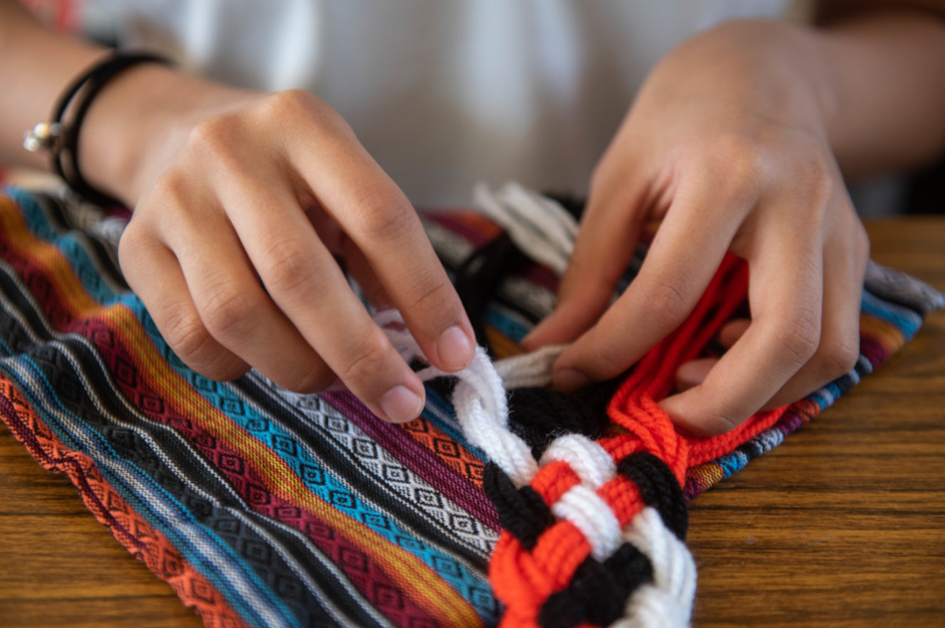 將傳統文化祭儀中配戴的情人袋,轉化為平日也可以搭配服飾的多變樣式,並搭配多股編繩配戴。聽情人袋的文化意義、了解文創的過程,兩人或三人合力製作編繩。這不只是手作體驗,更在過程裡互動、交流,隨著繩股的拉扯、交織,關係也慢慢纏繞一起而有了改變。