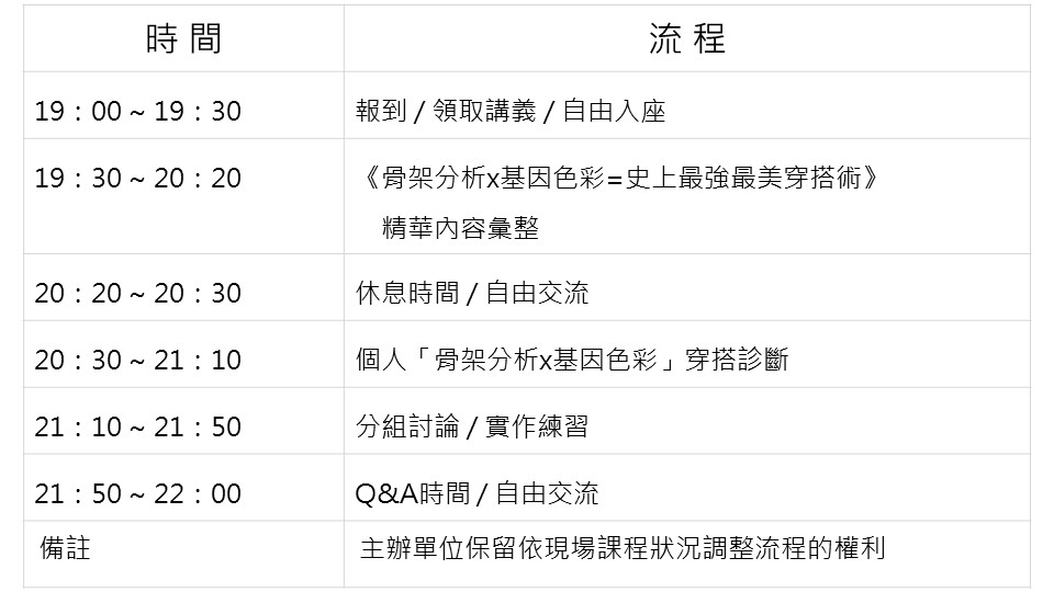 課程內容:書籍導讀+骨架分析/基因色彩+分組討論/實作演練,附學員講義,可拍照記錄