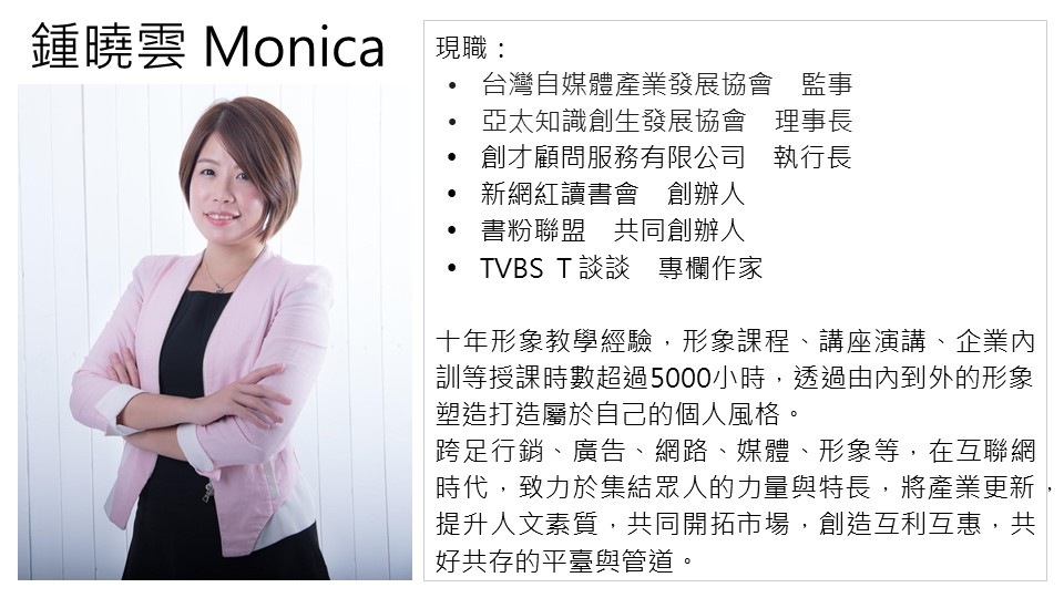 本次戀愛讀書會,讓您有學習也有練習。由【創才顧問服務有限公司】執行長、【新網紅讀書會】創辦人,具備十年資歷、超過5000小時授課時數的形象教學經驗的Monica老師,將會歸納出書中精華與大家分享,同時針對書中的實作項目帶著大家進行練習。