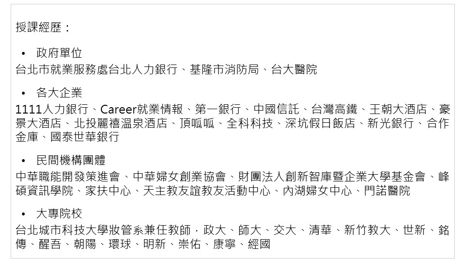 除了服裝的搭配可以改變氣質與氣場,舉手投足之間的肢體語言也是改變形象的重要環節。Monica老師也會教大家幾個小撇步,讓您自然流露出美感,協助您從內在到外表,擁有給人好感度UP的第一印象,打造屬於自己的個人風格!