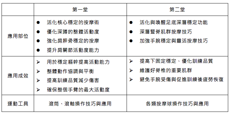 二天的課程中將分為「活化穩定度」與「活動度按摩」兩類型,同時應用到多條筋膜線的按摩技能。