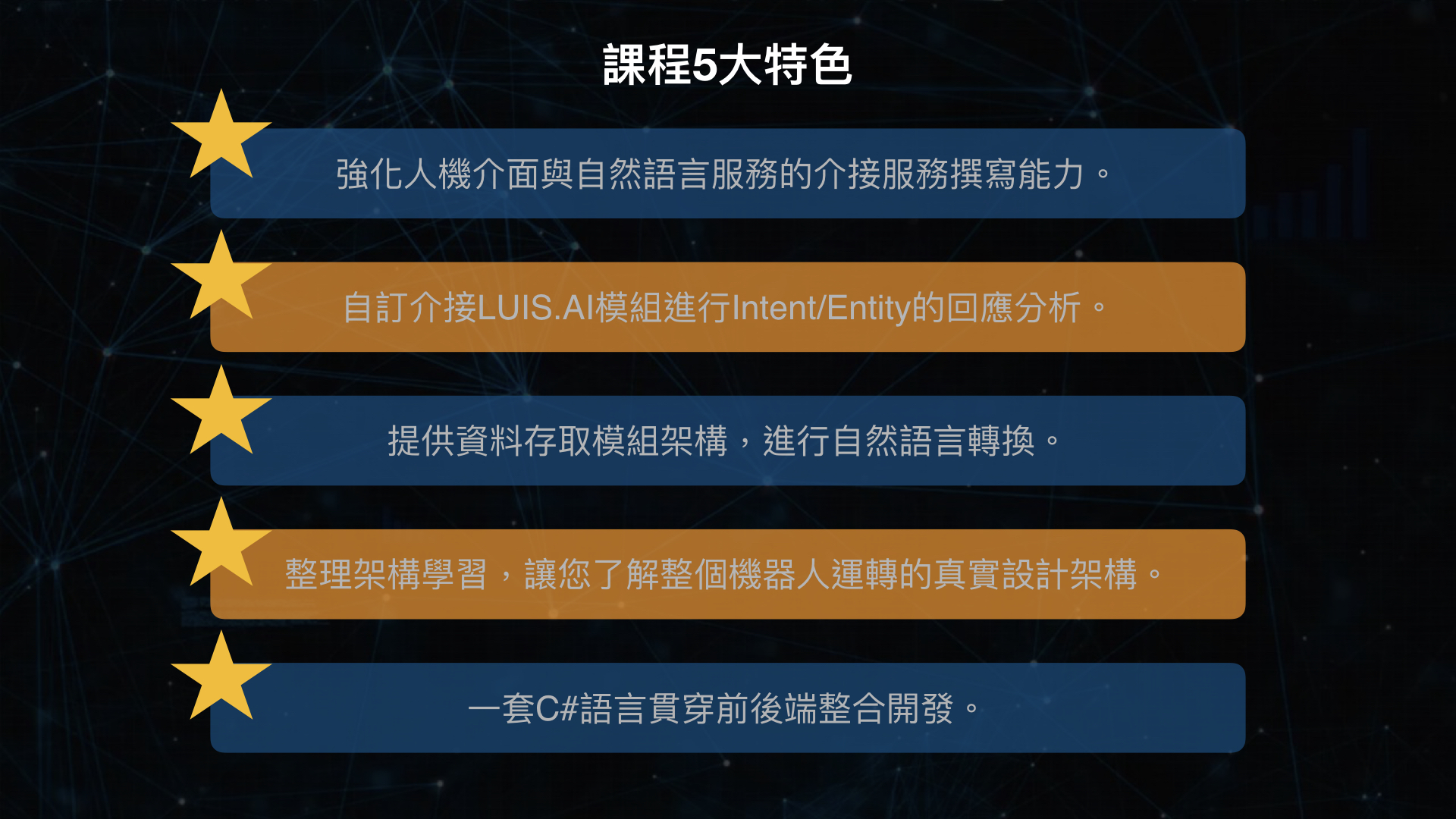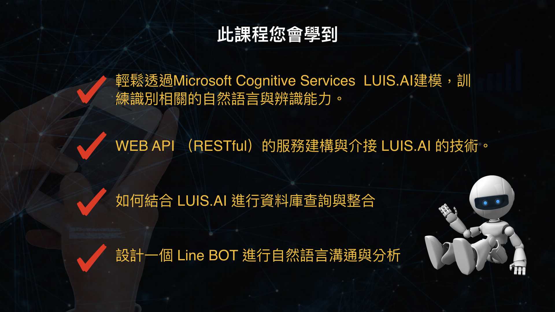 不過該如何訓練這些聊天機器人,使人類的自然語言,轉化成電腦能懂的語意並回傳服務訊息呢?因此這們課,宗興老師將用一天的時間,手把手的帶領大家運用 Microsoft 的 LUIS.AI,實際打造出一個AI客服機器人。課程中你會學到,如何設計與訓練自然語言AI模型,並進一步針對所辨識的語意進行優化,最後整合應用程式來與使用者進行互動。