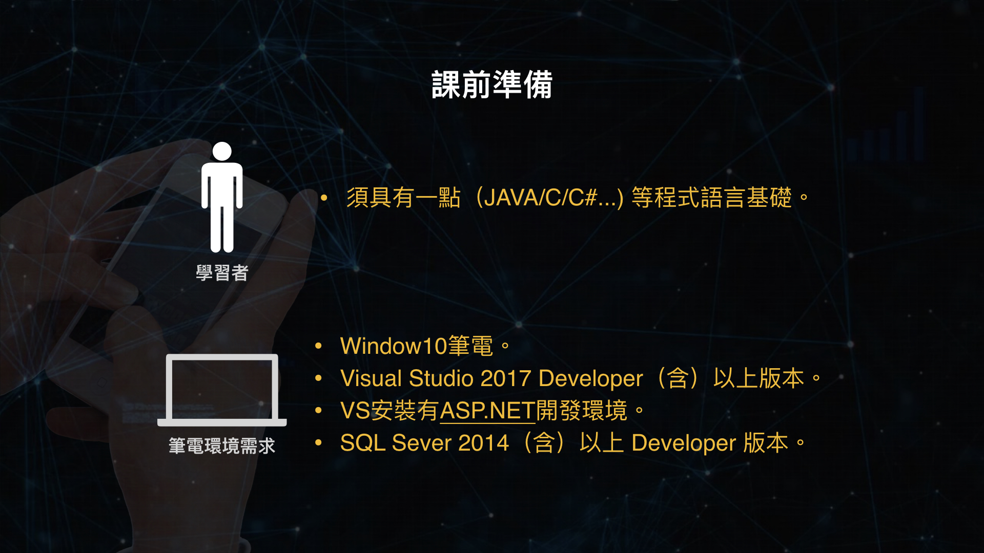 - 本班需自備Window 10 筆記型電腦,若為MAC,建議先灌雙系統。