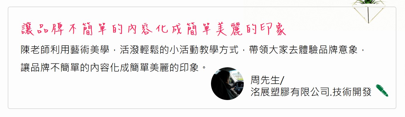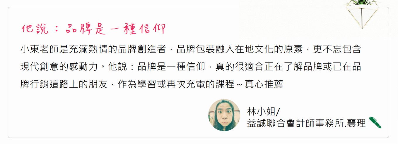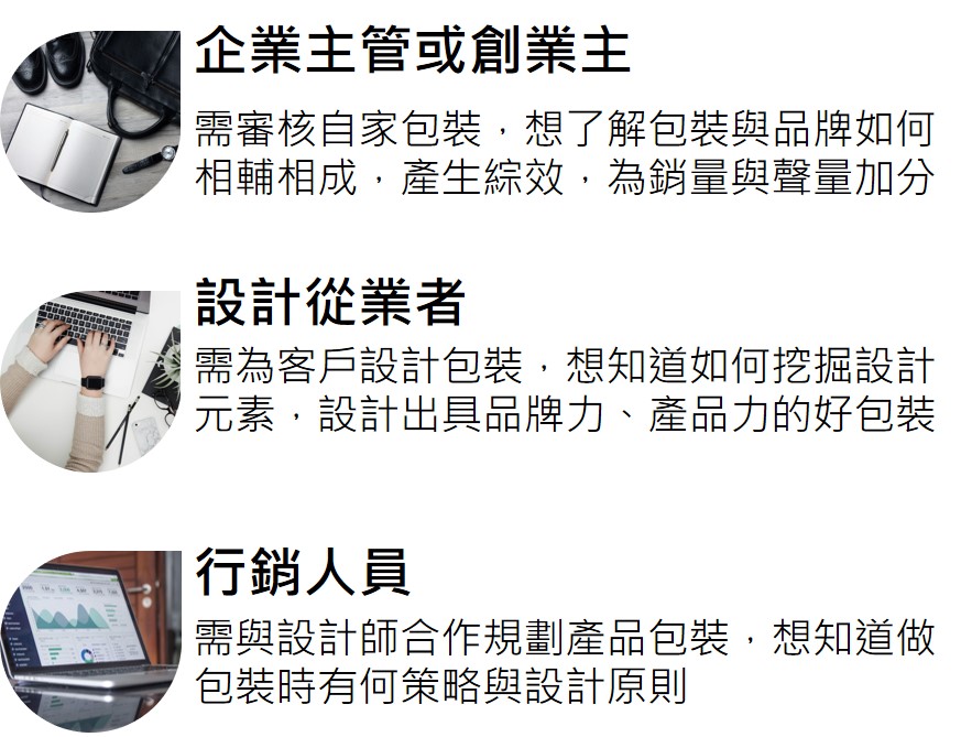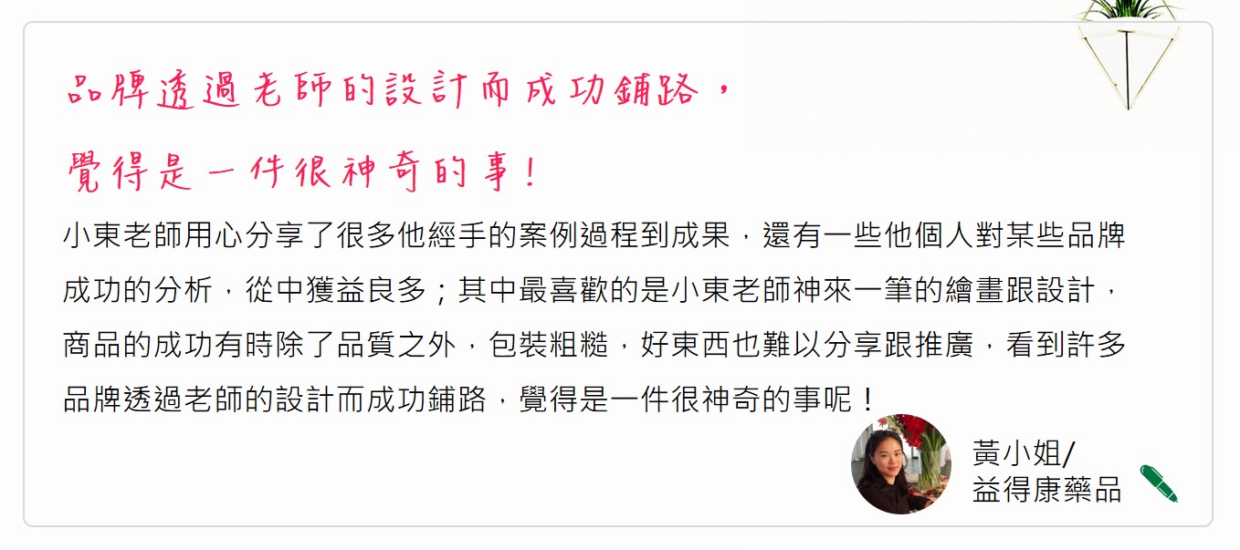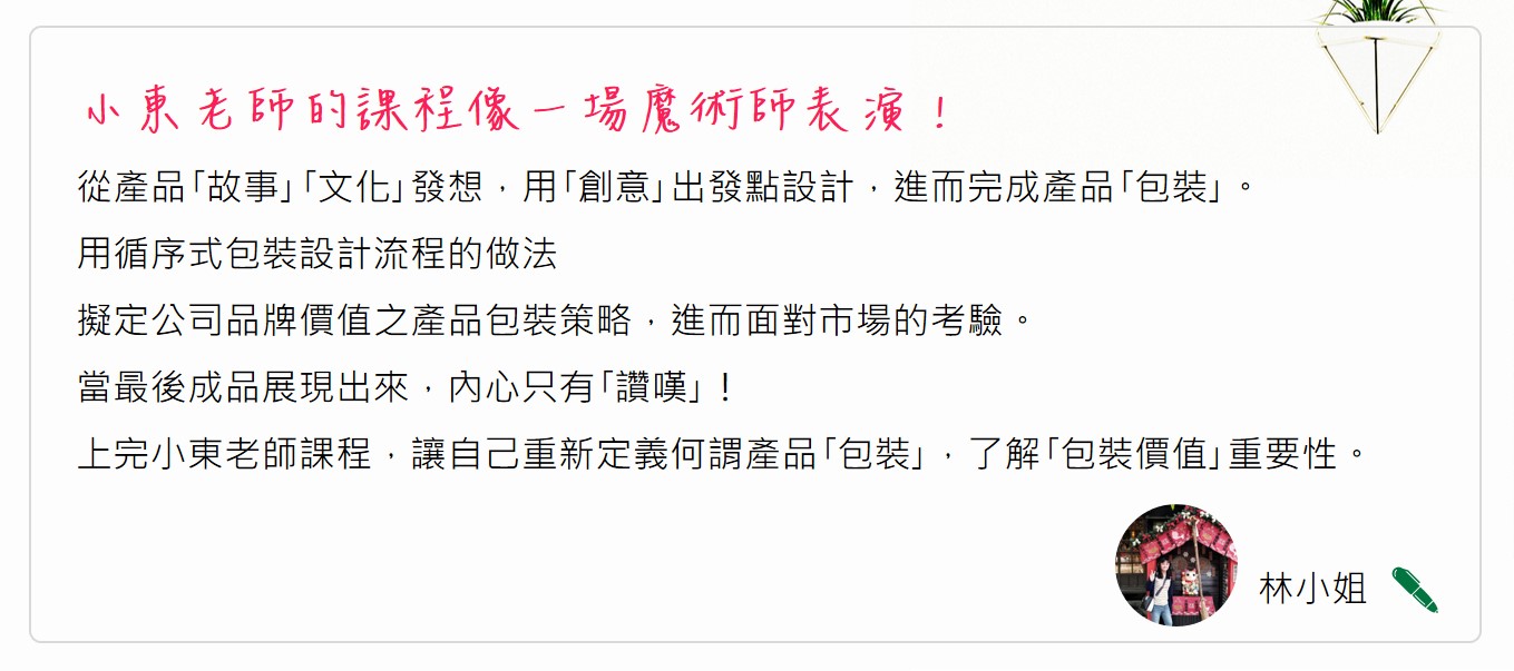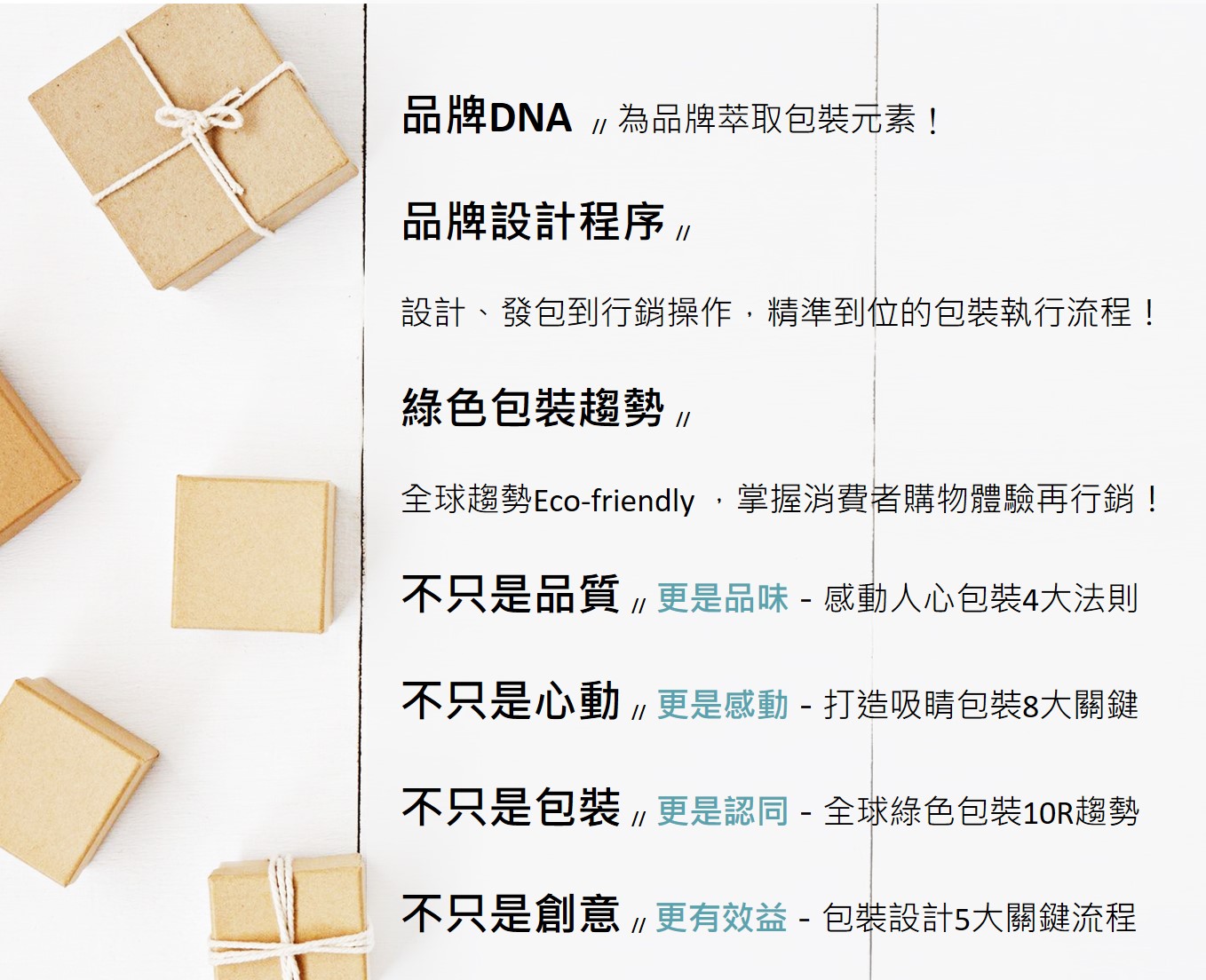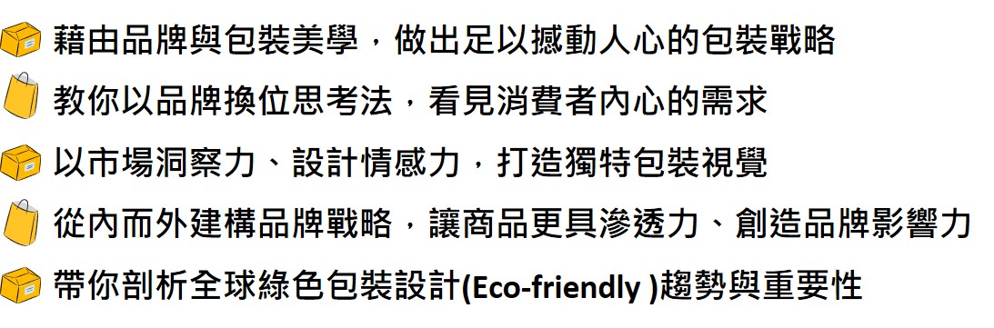 這次的課程,邀請到麥傑廣告總監/中華平面設計協會榮譽理事長 陳進東老師,以理論與實務案例,由淺入深,帶你學會如何藉由品牌行銷與包裝美學,產生一個符合品牌策略定位與感動人心的包裝設計戰略!教你以品牌換位思考法,看見消費者內心的需求!以市場洞察力、設計情感力,打造獨特包裝視覺,從內而外建構品牌戰略,讓商品更具滲透力、創造品牌影響力!