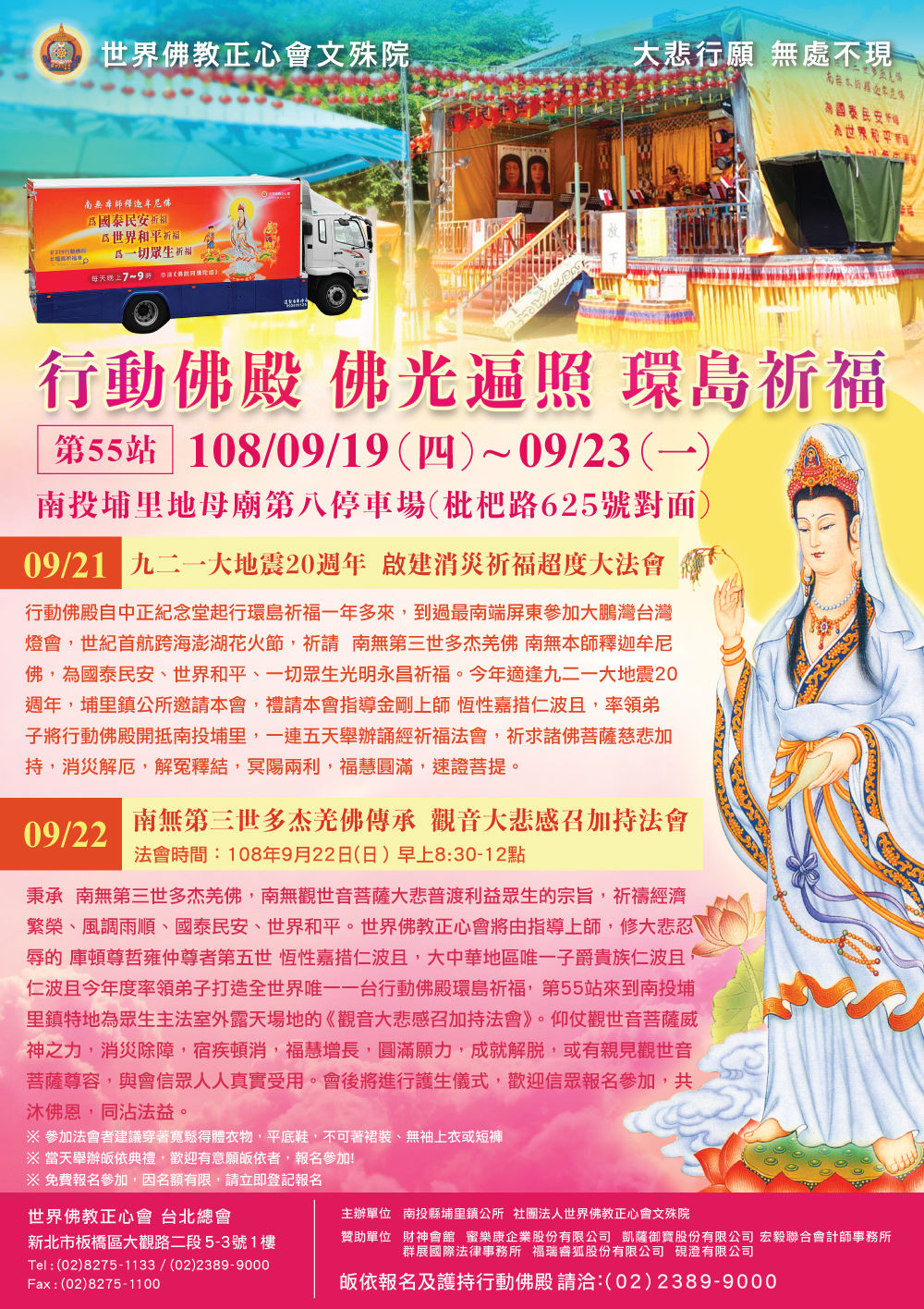 行動佛殿環島一年多來,到過最南端屏東參加大鵬灣台灣燈會,世紀首航跨海澎湖花火節,今年適逢九二一大地震20週年,埔里鎮公所邀請本會,禮請本會指導金剛上師 恆性嘉措仁波且,率領弟子將行動佛殿開抵南投埔里,一連五天舉辦誦經祈福法會,祈求諸佛菩薩慈悲加持,消災解厄,解冤釋結,冥陽兩利,福慧圓滿,速證菩提。