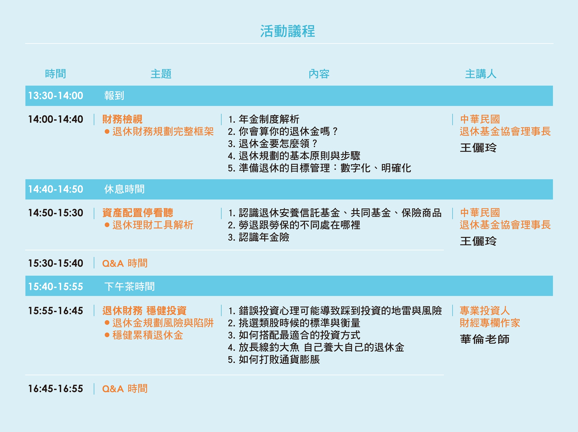 聯合報〈橘學校〉攜手中華民國退休基金協會王儷玲理事長、以及專業投資人、財經專欄作家華倫老師,以協助你提高自己的財務智商(FQ)為核心,教你帶得走的實用方法,帶領你建構完整的退休理財知識。