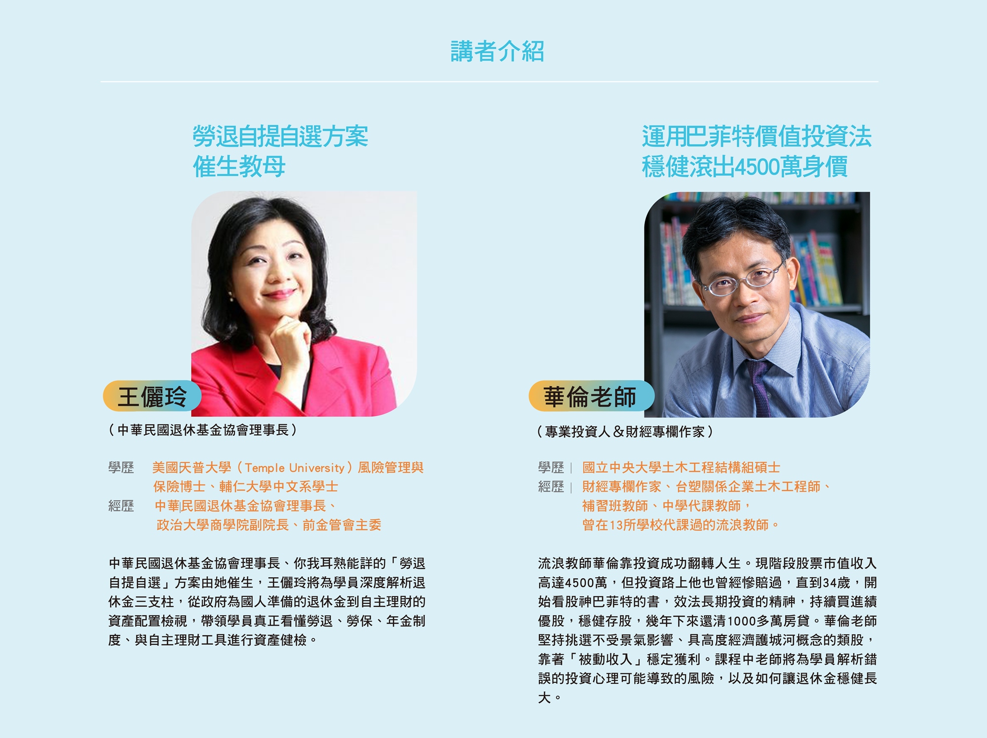 中華民國退休基金協會理事長、你我耳熟能詳的「勞退自提自選」方案由她催生,王儷玲將為學員深度解析退休金三支柱,從政府為國人準備的退休金到自主理財的資產配置檢視,帶領學員真正看懂勞退、勞保、年金制度、與自主理財工具進行資產健檢。