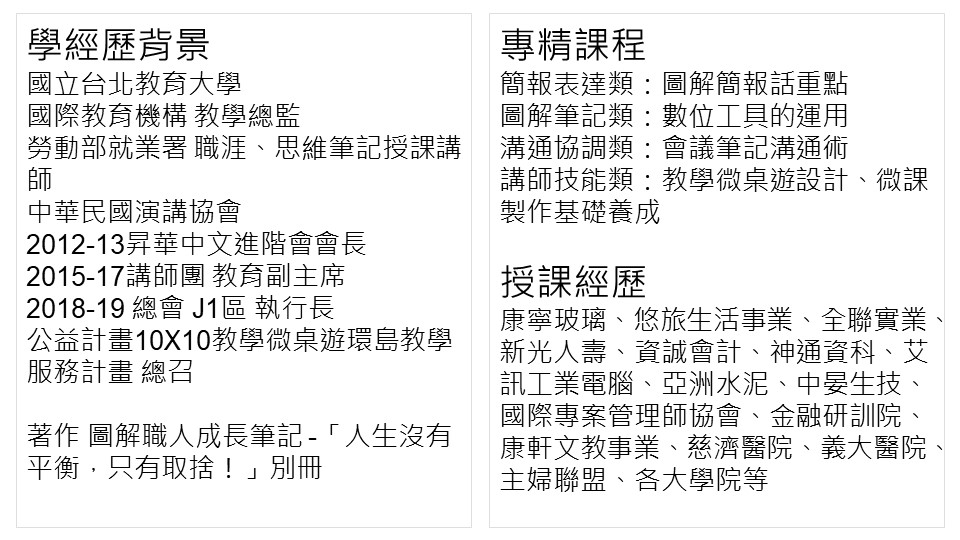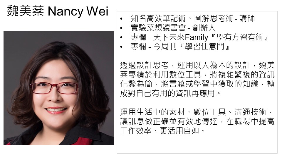 這堂3小時的職涯盤點旅程,美棻老師將帶領大家使用3項職涯探索工具-「專屬的個人密碼」、「四角溝通模式」與「職涯資本畫布」,讓你可以從了解自己開始,看懂自身特質與性格,到溝通與行為模式的習慣挖掘,最後進入工作的資源盤點與未來規劃,讓原本混亂or無趣的工作生活回歸到有意義、有條理的順流狀態,這就是職場盤點術最厲害的地方,也是每個成功人士可以愈工作愈順的最大秘密。