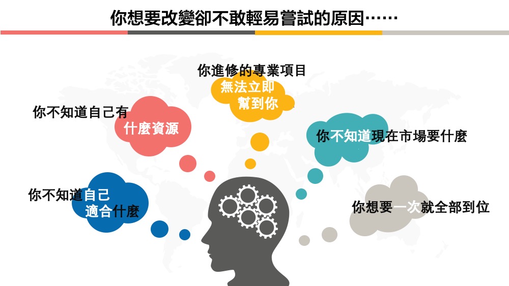 ⋯⋯這些種種困惑都會讓你不敢輕易挑戰其他的工作,但對現在的現況卻不滿意的你,其實都是因為: