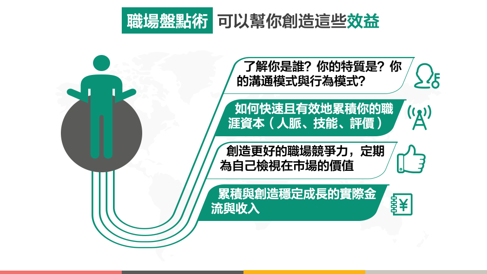 你我皆知工作占人生3分之1的時間,也許你會覺得,工作也不過只影響3分之1的人生,但事實上,人生中的自我價值高低、生活品質的優劣,對80%以上的人來說,和工作成就息息相關。因此,「職涯盤點術」絕對是你我必須要懂的人生必修課。