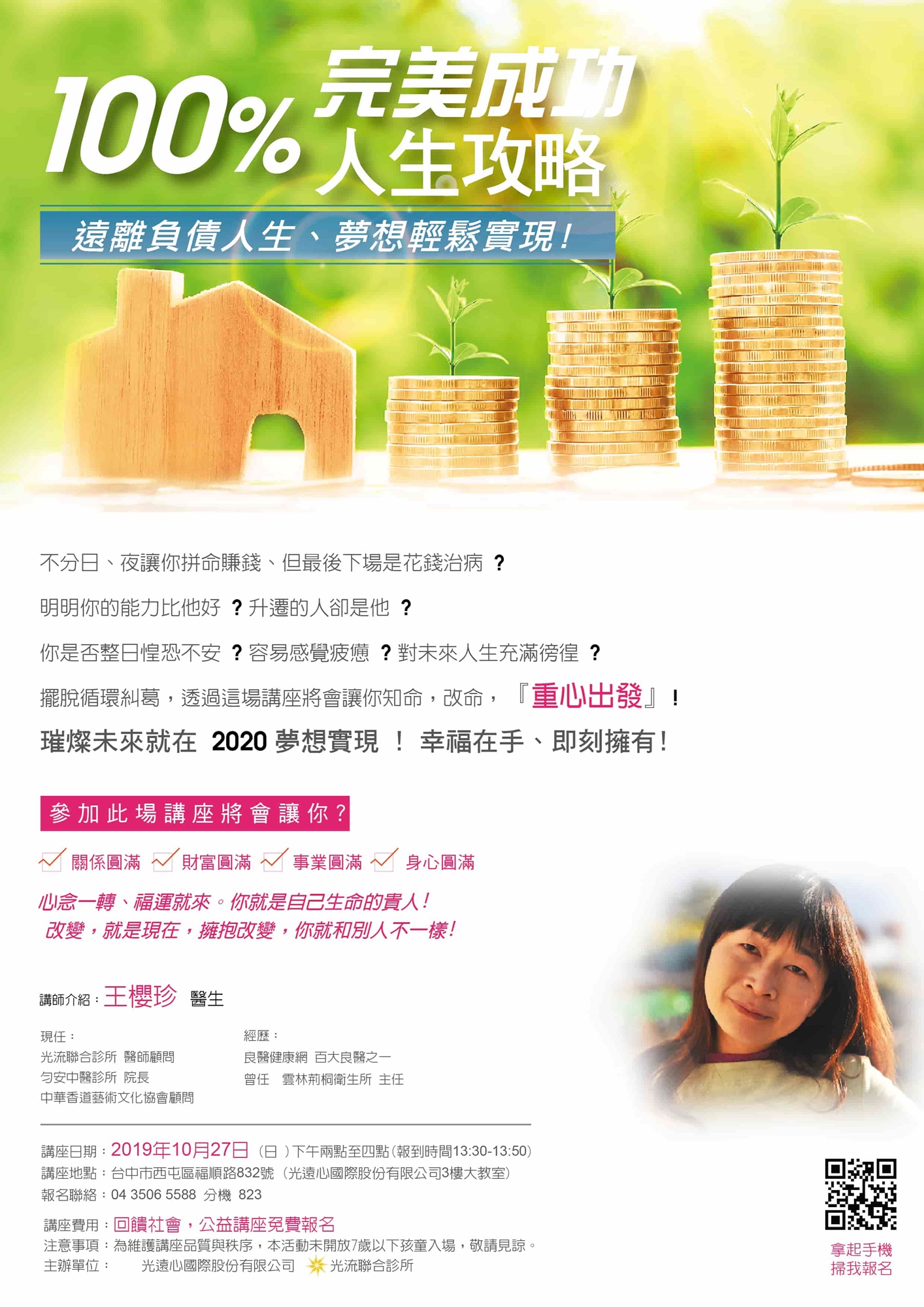 2019即將結束 ! 你願意擺脫這種生活,重新走向璀璨人生,擁有財富的未來? 讓仁醫 王櫻珍醫師笑談為您解析,分享成功命運的方法! 想要脫貧,紅光滿面笑容可掬嗎? 那您一定不可以錯過此場講座 !
