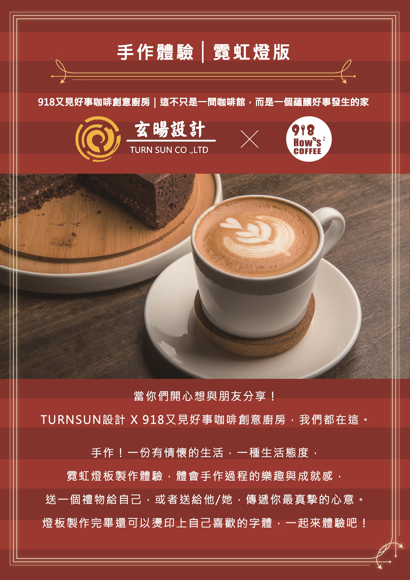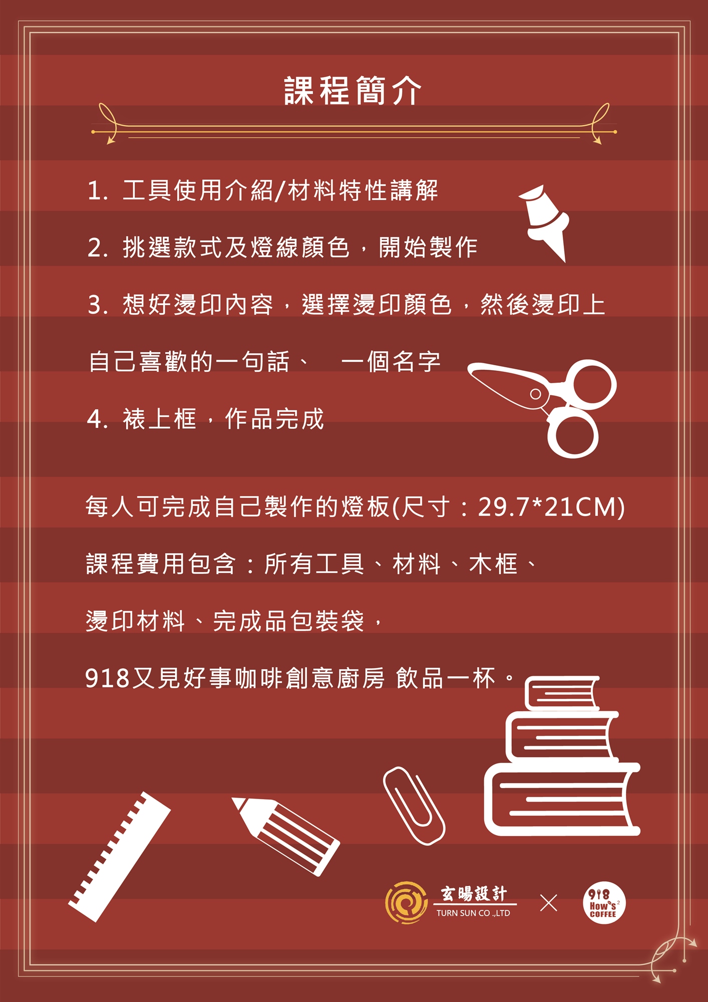 ●課程費用包含:所有工具、材料、木框、燙印材料、完成品包裝袋,及 918又見好事咖啡創意廚房 飲品一杯。