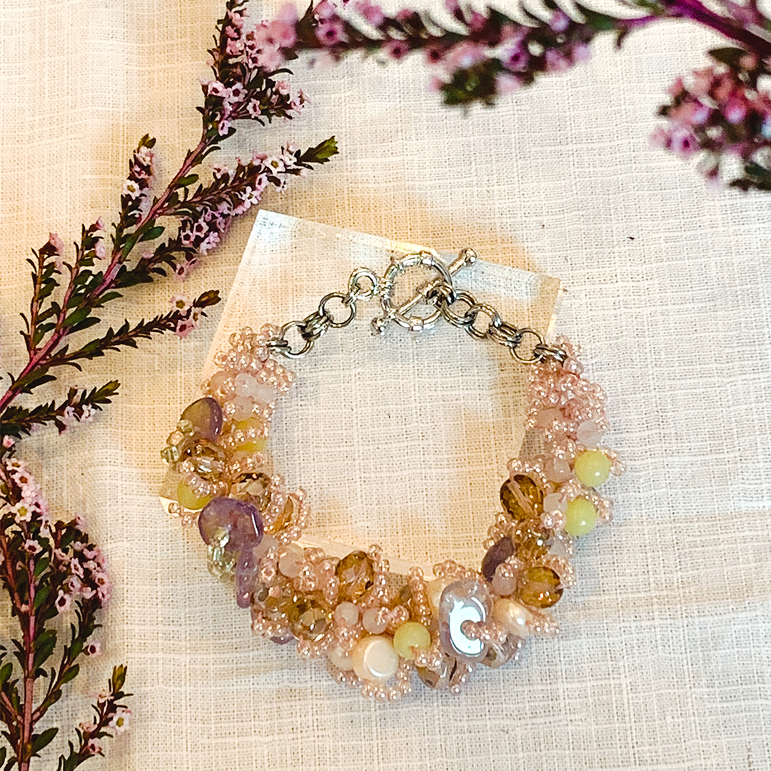 你喜歡大海的自然奔放還是花朵的甜美嬌羞?課程以春、夏兩季為設計靈感,夏日海洋的藍綠色、春天生意盎然的粉色花朵,利用珠寶工藝的技法『鉤針』,描繪出春天與夏天的不同想像。