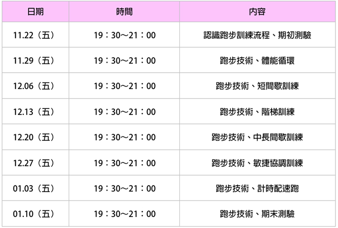 費用:4000元,共8堂,另有一次計時模擬路跑