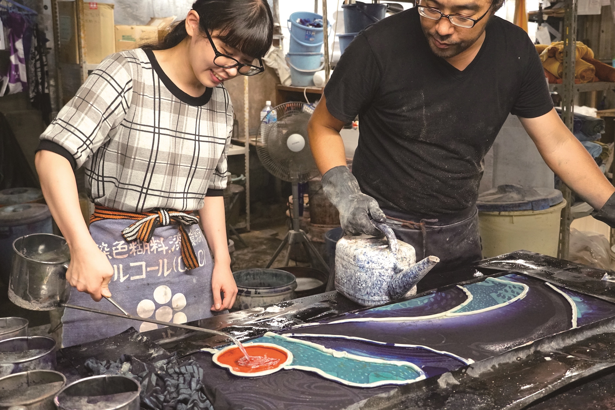 在注染職人講解「濱松注染」時,民衆可親自體驗注染手帕大小的浴衣布料,