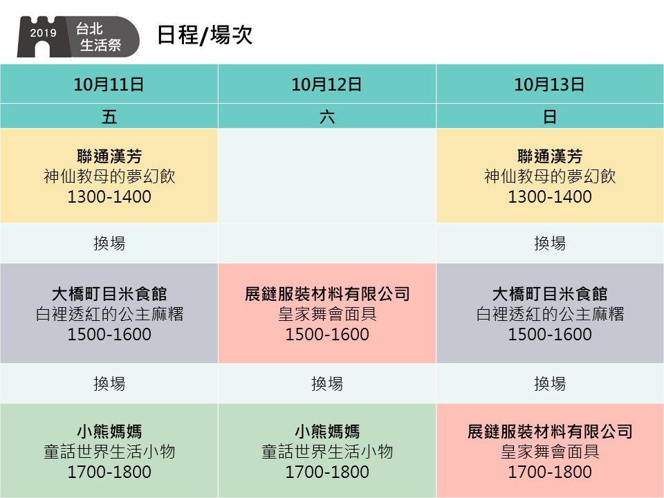 活動時間:2019/10/11(五)~2019/10/13(日) 13:00至18:00[場次詳見下方列表]