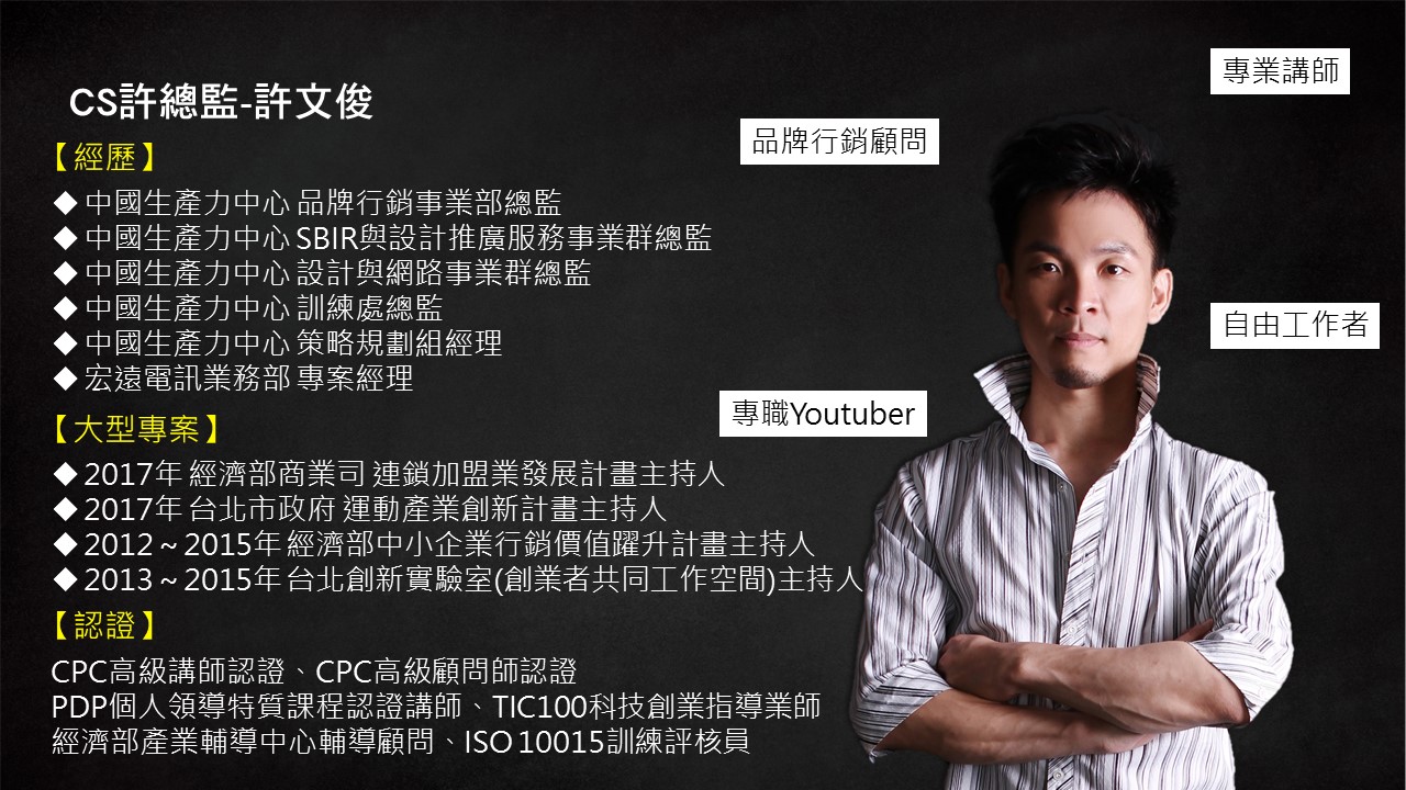 許總監曾任職於台灣最大管理顧問機構CPC生產力中心任職17年,專長為品牌策略規劃、創意行銷、網路行銷、社群經營,以及團隊建立。近年來持續耕耘企業家學習網絡,並擅長運用網路科技結合設計美學,輔導中小企業行銷價值躍升,協助產業界從代工走向品牌。