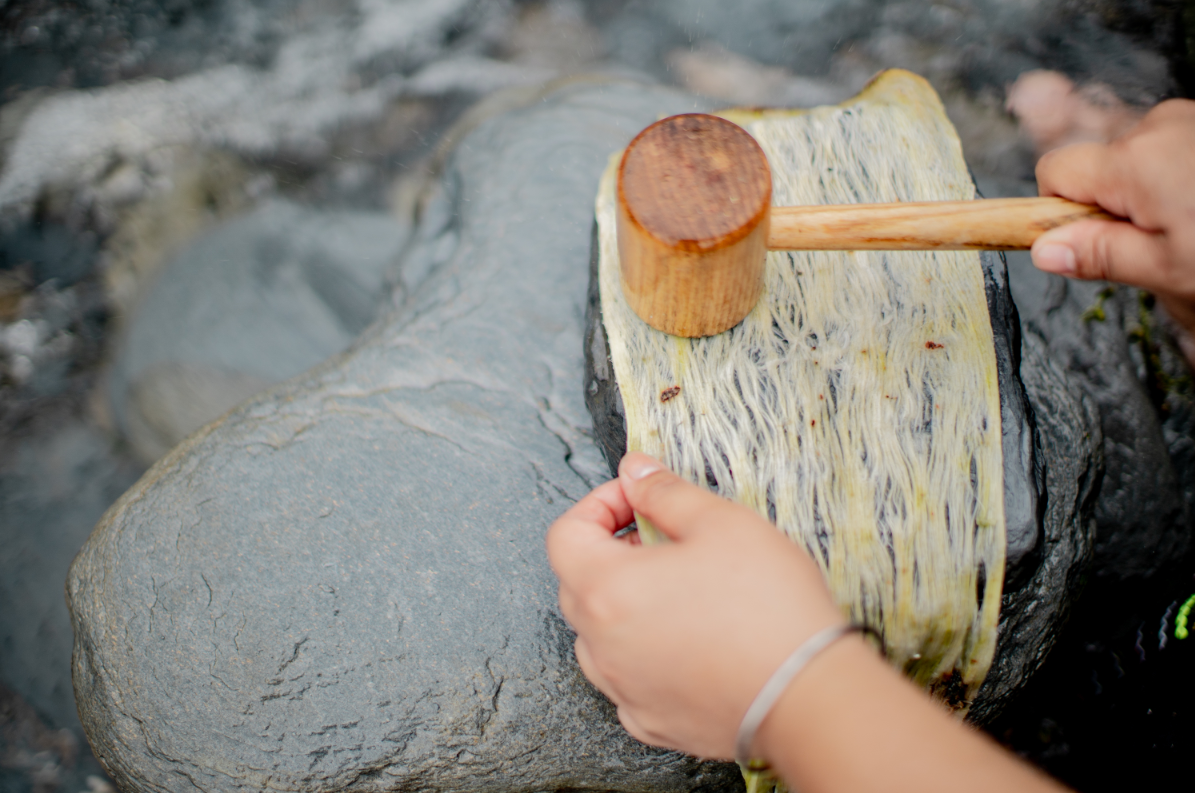樹皮布是南島語族經常使用的材料,從構樹採集後取下樹皮,經過敲打與加工,可以拿來當作容器與製作衣服。蓋亞那工作坊的二女兒依布,可以說是這方面的專家,她長期專注於傳統纖維植物的研究,以及包括苧麻、竹籐編、植物染和構樹皮等植物纖維的取材與應用,希望透過田野調查與教學,重新詮釋傳統植物在現代生活運用的可能性,並且把工藝製作的精神,發揚光大。來到這裡,可以一起DIY敲打構樹皮,感受樹皮加工延展的原野體驗。