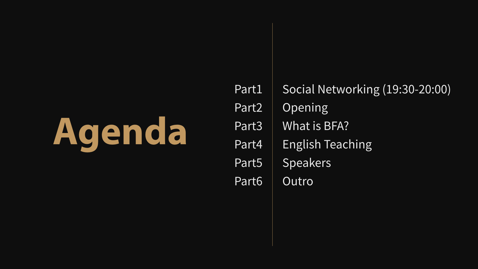 承襲 BFA 簡報小聚交流互動與分享的精神,每次聚會由「主題分享」與「自由交流」兩個環節組成。「主題分享」將由三位講者 (Before, After, Pro Speaker) 依次帶來 12 分鐘的英文簡報溝通故事、經驗或技巧分享。