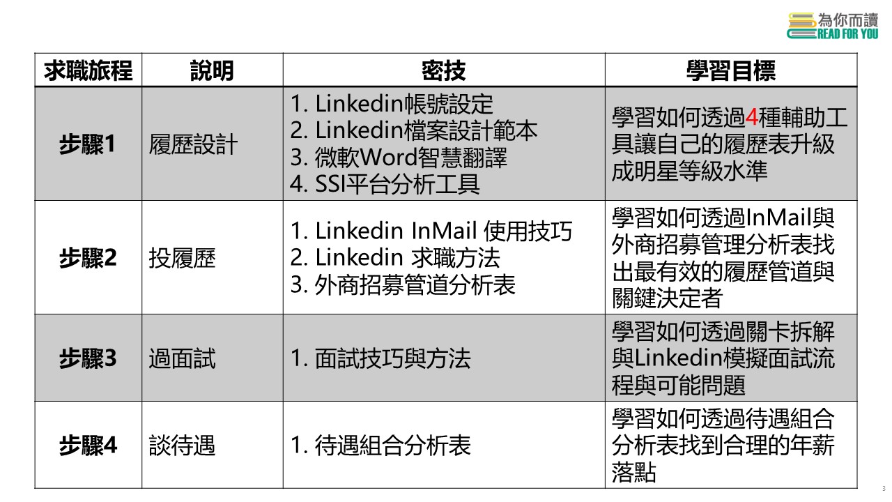 Steve將透過流程拆解與問題分析的技巧,告訴你如何透過有效工具、有效分析,讓你從履歷撰寫、履歷投遞、人資與部門主管面試、到最後的薪水待遇,找出每個工作應徵環節可能出現的問題。帶領我們手把手建立自己的LinkedIn檔案,讓你的求職、轉職、職涯晉升之路,更順暢無礙!