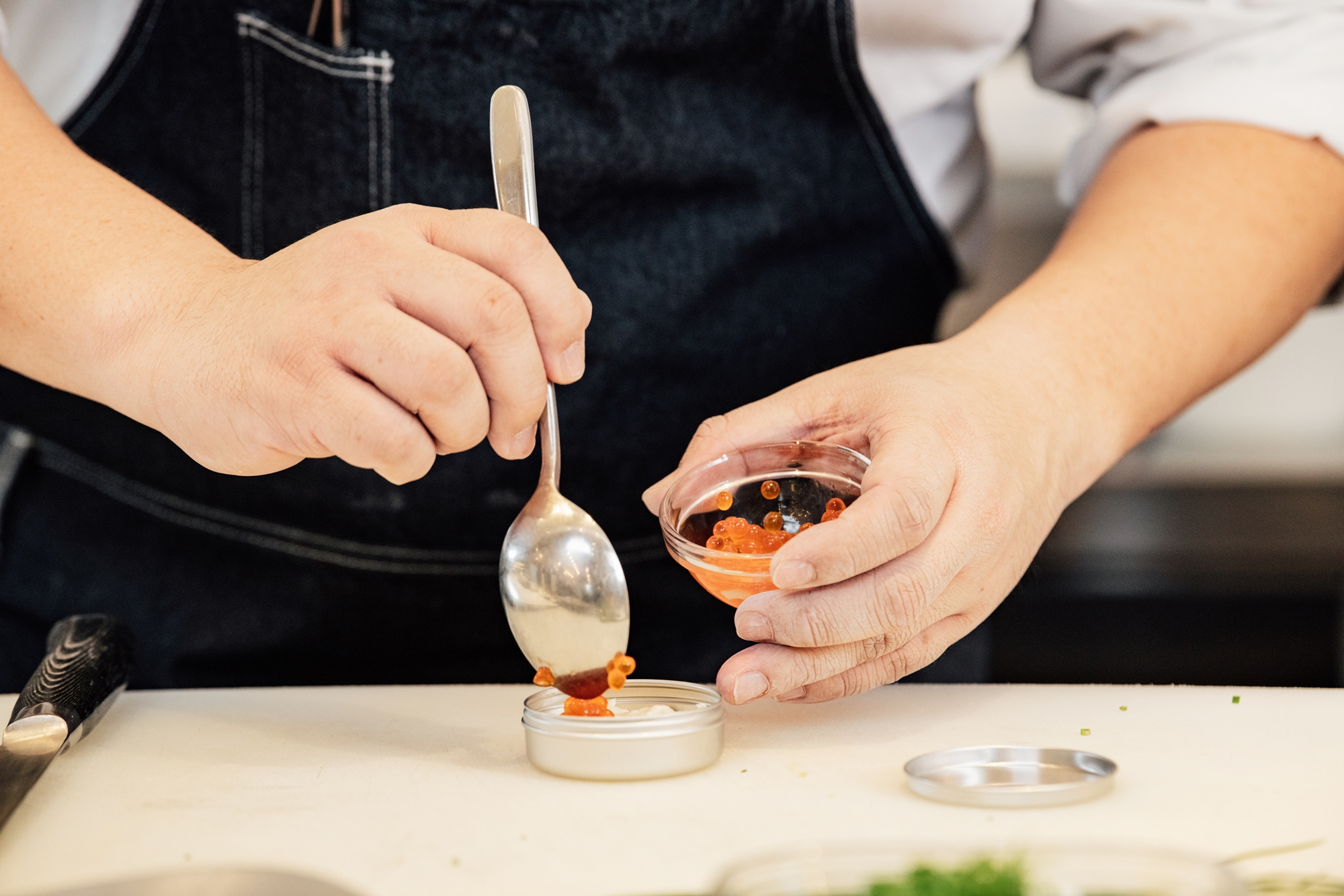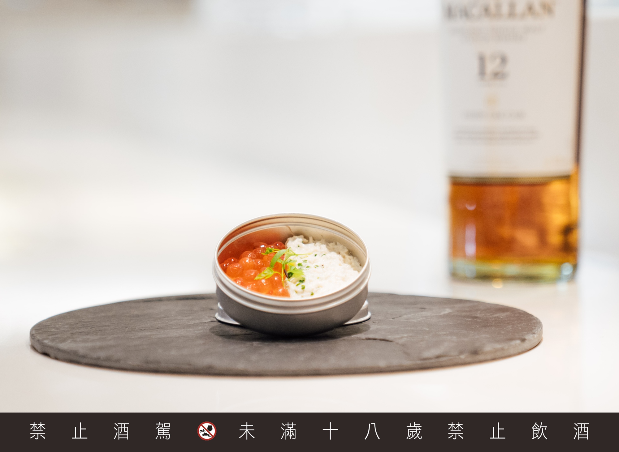 與「經典雪莉桶12年」合奏的「海洋藏寶」,Jason選用了來自印尼的藍花蟹肉與日本的鮭魚卵,在特製的淺盤上以對半方式呈現。