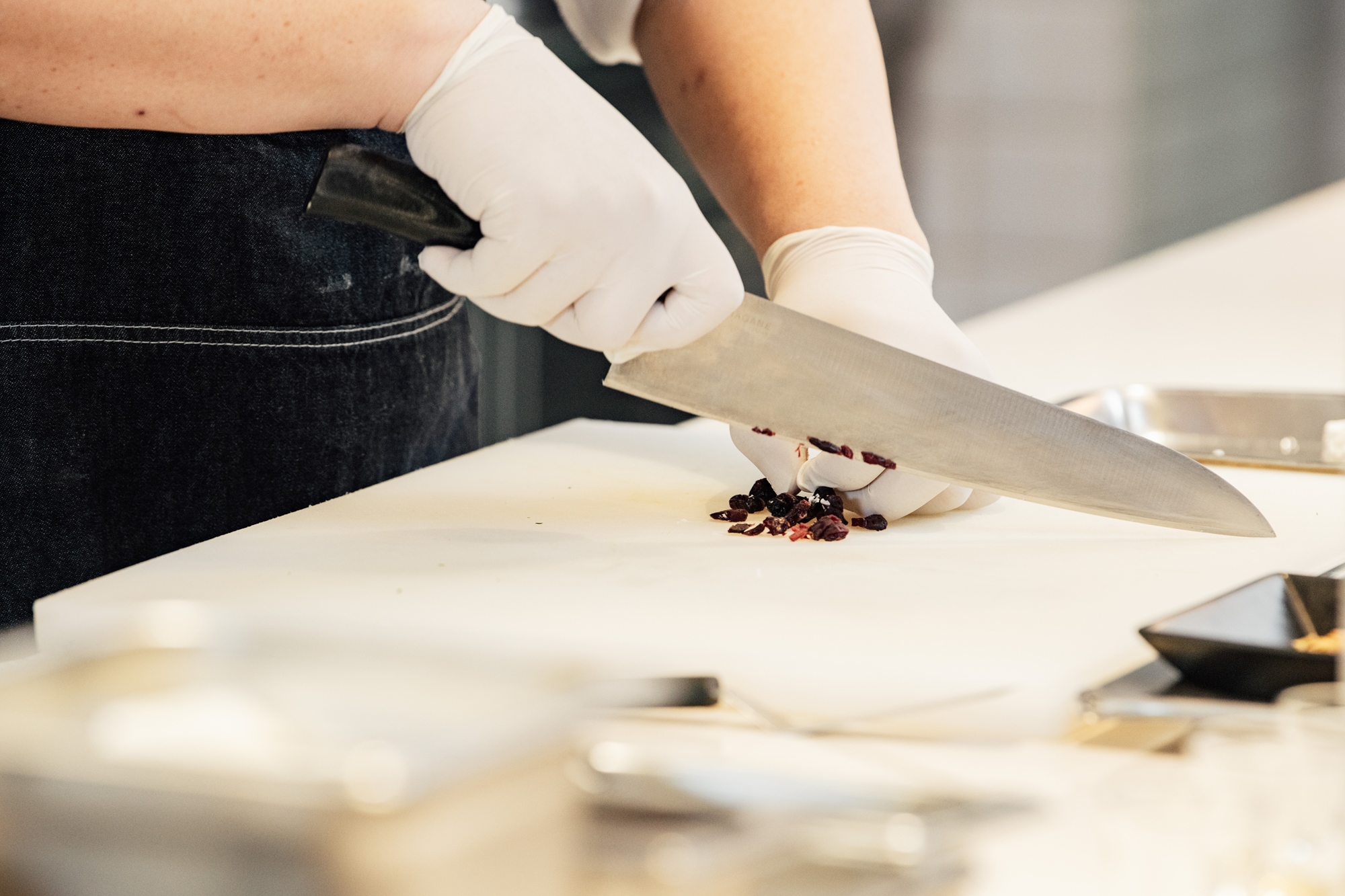 「乳酪棒棒球」以自製的ricotta跟cream cheese加入蔓越莓乾和堅果,做成容易食用的棒棒糖造型,搭配麥卡倫「御黑」甜蜜餞與柑橘的香氣,與蜂蜜、巧克力與乾果的口感,提點下更顯溫潤。