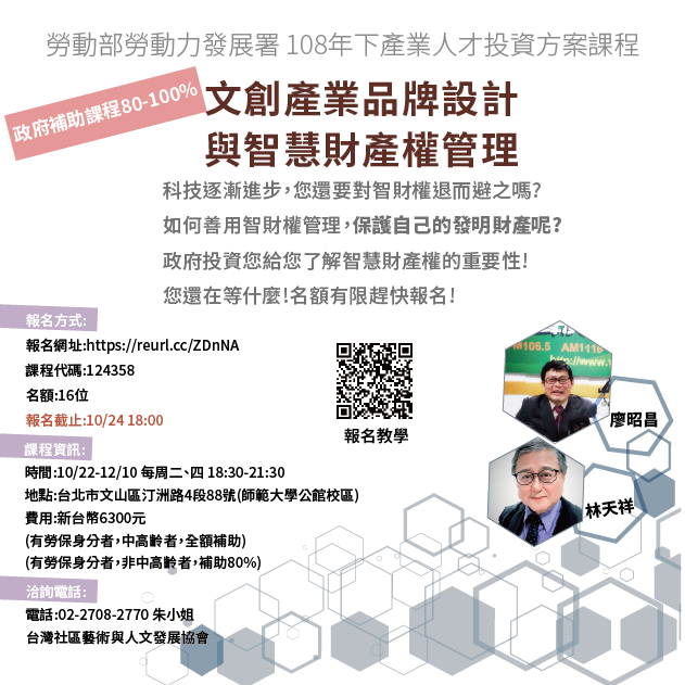 【上課時間】108/10/22 ~ 108/12/10 每週二、四 18:30~21:30