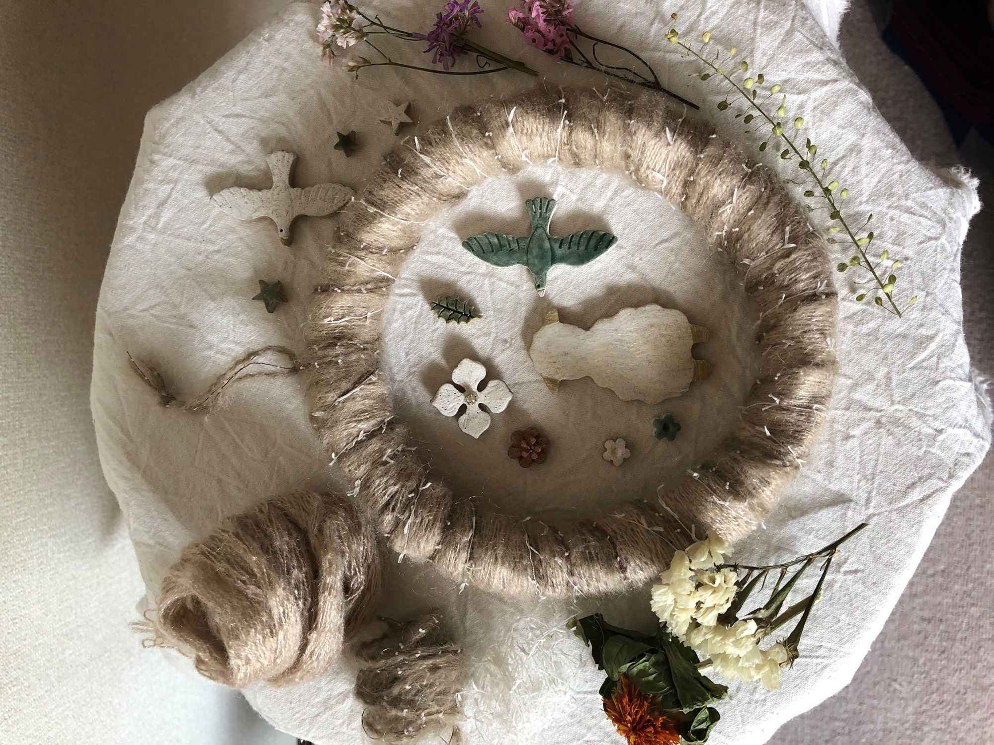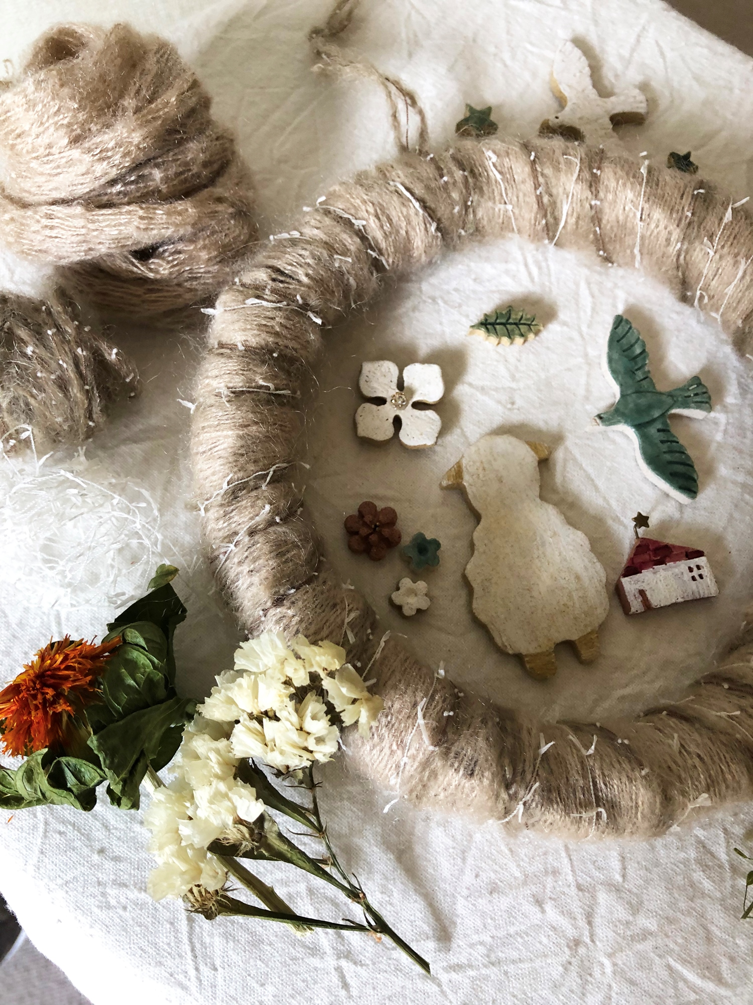 ①花圈底座,毛線,乾燥花,陶土等材料