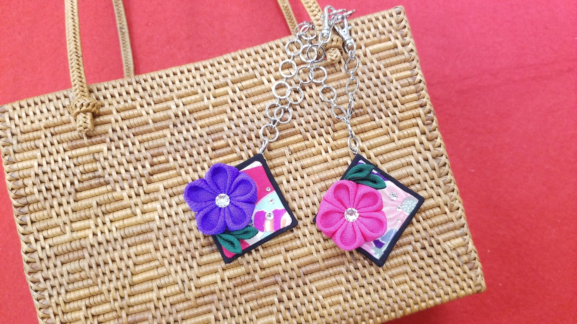 以舞妓美麗的一本簪而聞名的「つまみ細工」,是從江戶時代流傳下來的傳統工藝。學習丸つまみ(丸形花瓣)與剣つまみ(劍形花瓣)等基礎技法,製作皮包掛飾。