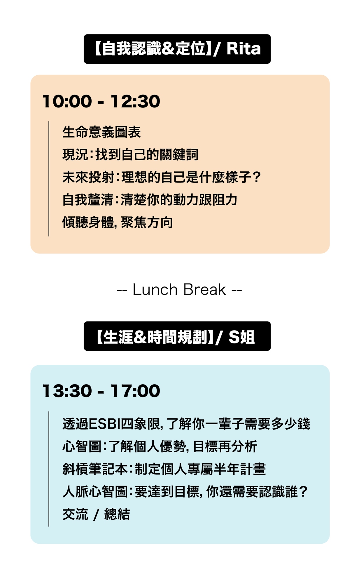 一整天的工作坊,早上會先透過生命意義圖表、分組討論、身心探索,讓你聆聽內心的聲音,找到自己的優勢和定位。下午再依據ESBI四象限、心智圖和S姐獨家規劃「斜槓筆記本」,幫助你清楚看見自己的理想生活,並step by step帶領大家制訂自己專屬的人生規劃,讓你離開這場工作坊時,能帶著明確又可執行的計畫,即刻開始改變!