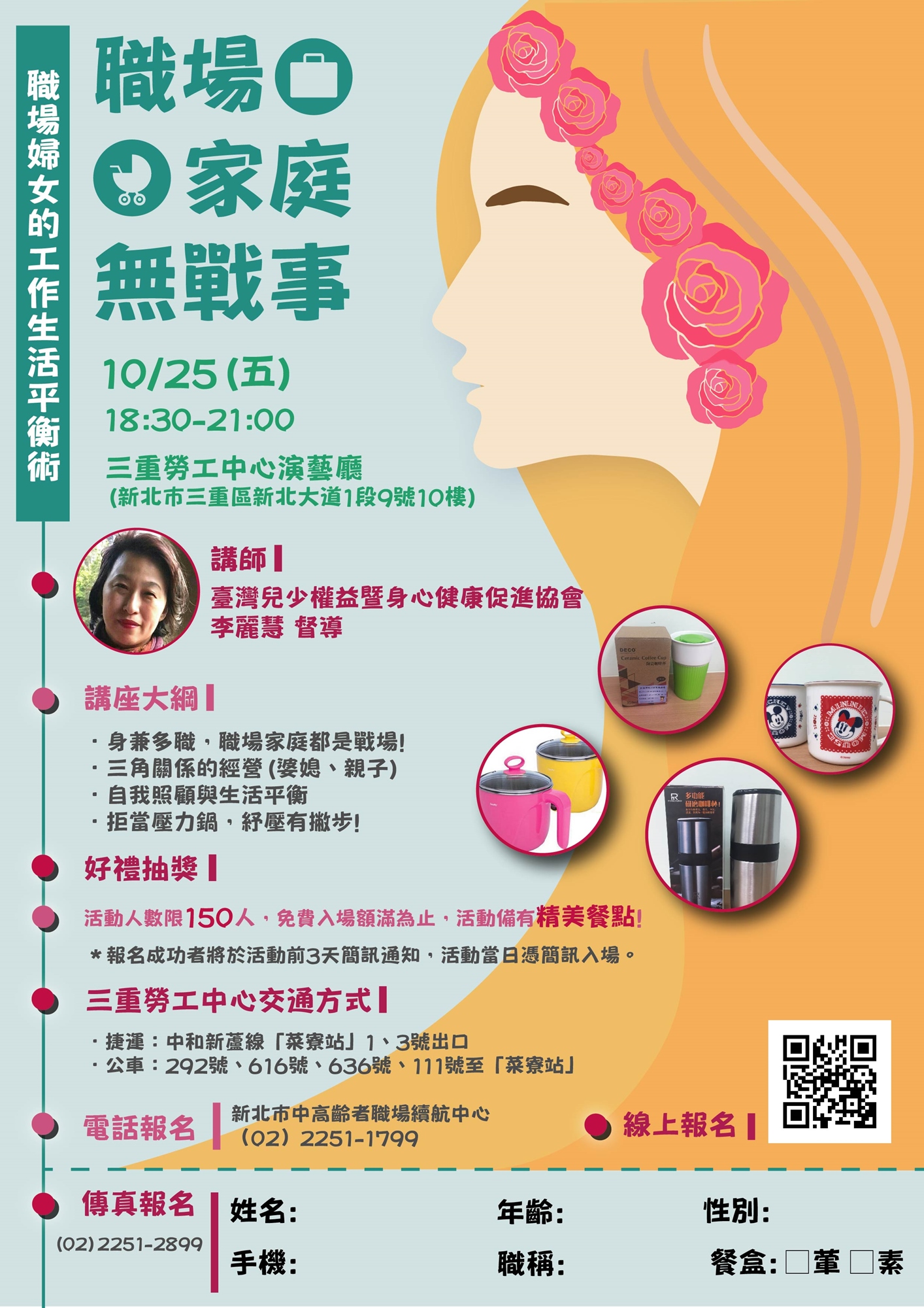 10/25(五)晚間18:30「職場家庭無戰事:職場婦女的工作生活平衡術」講座,以性別平權、婚姻家庭經營及壓力調適的視角,協助兼顧職場與家庭的女性朋友覺察壓力來源,跳脫為家庭犧牲自我的慣性思考。同時,學習溝通策略、工作與照顧分配及紓壓方法,帶領妳突破事業家庭兩頭燒的困境,化解因照顧問題衍生的婆媳、夫妻及親子衝突,用平衡力創造職場家庭雙贏人生!