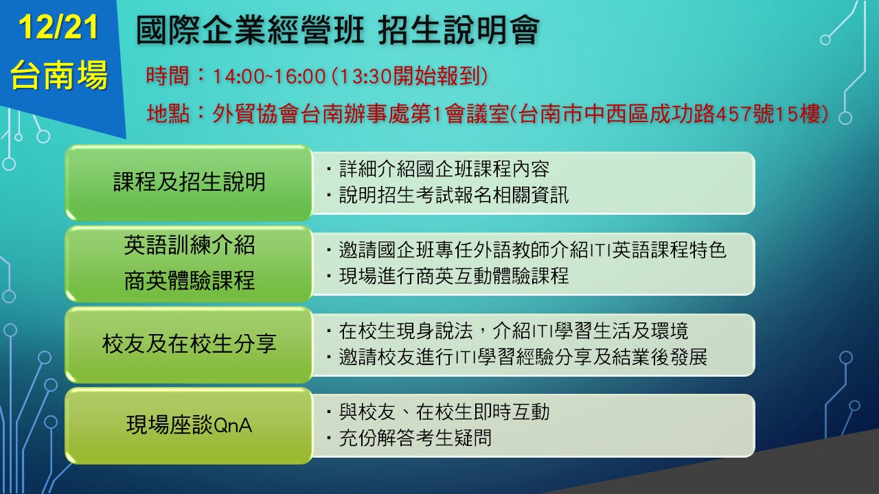外貿協會於民國76年接受經濟部委託成立國際企業人才培訓中心 (International Trade Institute, 簡稱ITI),辦理「國際企業經營班」(簡稱國企班)專業人才培訓,以外語及經貿雙主軸課程貫穿訓練內容,多數校友投入國內高科技產業、傳統產業及經貿相關機構,從事國際行銷及業務工作,表現普受業界肯定與好評。109年將招收二年期英、日、德、西、越、印尼、泰語組及一年期英、越語組及經貿實戰組。