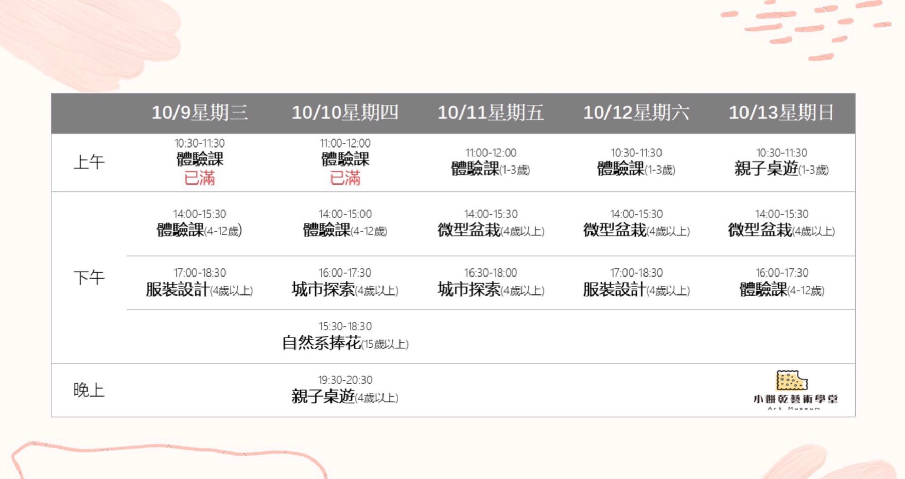 以下部分課程僅限10/9-13期間推出哦!名額有限,搶先詢問、預約吧!