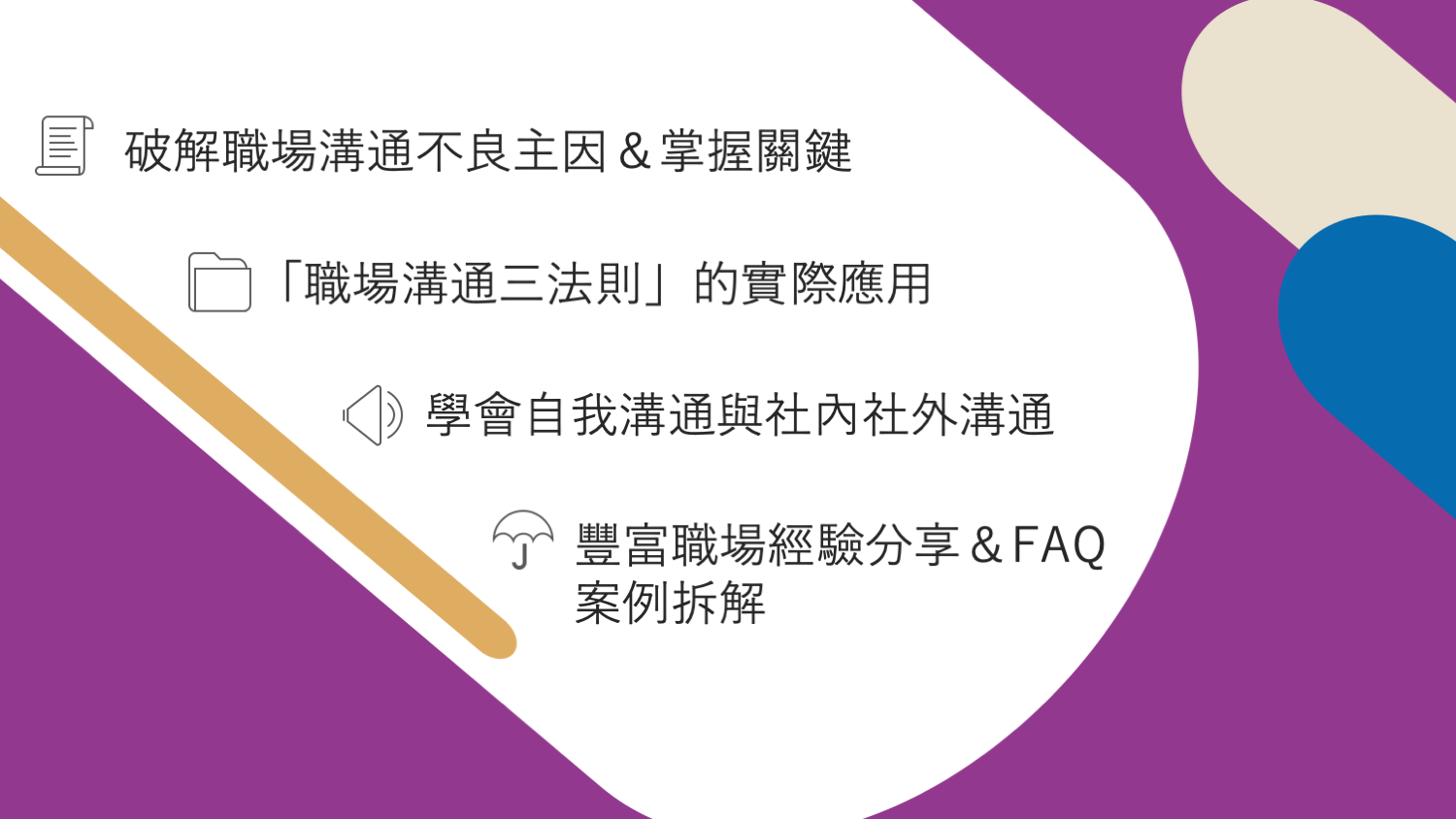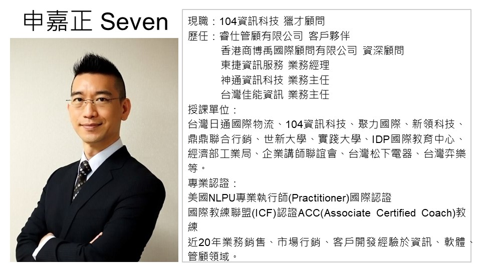 本堂課程結合4大主軸:「薩提爾的冰山模式」、「教練式互動對話」、「NLP神經語言程式學引導」與「資深獵頭的職涯實際經驗談」,傳授你職場溝通的「停看聽」法則,幫助你解決80%的職場溝通問題!本堂課,針對職場人士工作上的溝通需求,適用於各產業、各職務的溝通狀況。由資深獵才顧問Seven老師授課,將深入找出你溝通不良的問題核心,明確定義在不同場合需要的溝通目的,全方位破解你的溝通難題與提升你的溝通技巧。