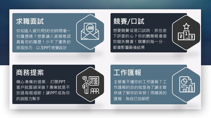 一份好的PPT幫助你吸引到注目、增加說服力或是得到讚賞,更可以在商業競賽、口試論文、求職面試、商業提案等重要場合獲得機會!