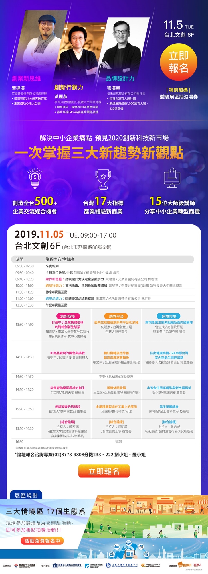 本次透過全天論壇及生態系成果發表展,探討中小企業跨領域創新之三個主要面向:「創新商模」、「跨界平台」、「跨境市場」,讓你洞察未來產業新發展。