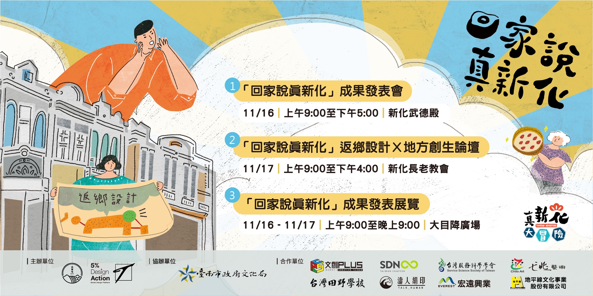 本次「回家說真新化」返鄉設計行動,由在地團隊、在地企業,以及社會設計平台三方合作出發推動新化返鄉設計行動,我們期待在論壇上將這次「新化經驗」與更多關心地方創生議題的產官學界夥伴,從地方到中央,從公部門到私部門,透過分享與對談,挖掘更多回應在地議題與合作的契機!