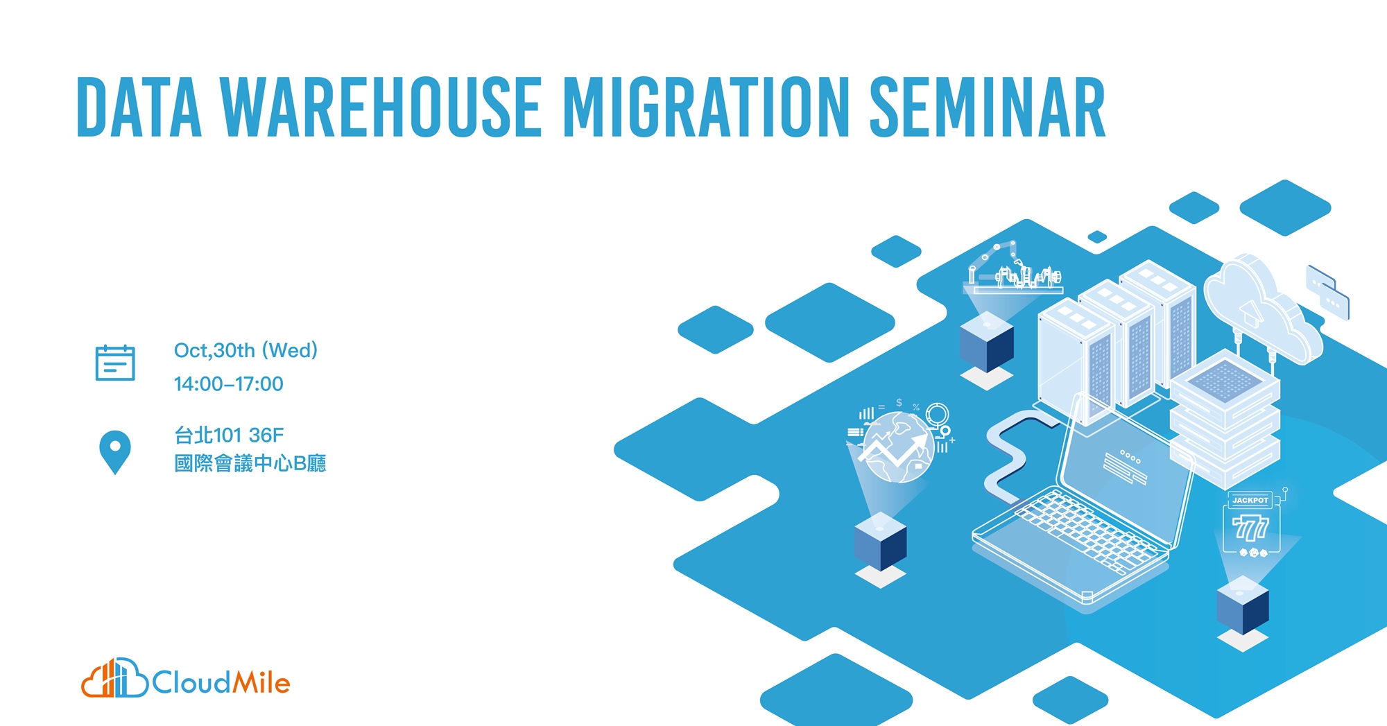 為協助企業以更輕鬆、更有效率的方式迎戰數位轉型,CloudMile 特別針對 Data Warehouse Migration 規劃專場分享會,讓您了解從地端環境遷移上雲可能面臨的挑戰並提供合適的解方,同時也將解析 Google BigQuery 強大的效能及其優勢,進而協助您洞悉數據的價值、挖掘提升營運效能的關鍵。