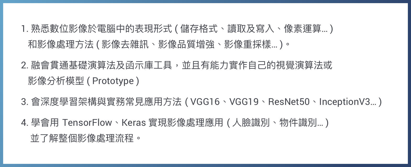 電腦視覺 (Computer Vision)為深度學習領域中相當熱門的研究領域,在產業界也有相當多的應用需求。本課程聚焦於電腦視覺技術與深度學習網路,從基礎的影像處理(OpenCV)切入,逐步帶領學員學習電腦視覺深度學習技術,包含卷積神經網路 (CNN) 基礎、經典 CNN 模型、物件偵測實作 (Object Detection) 與人臉辨識 (Face Recognition)、MobileNet 等。